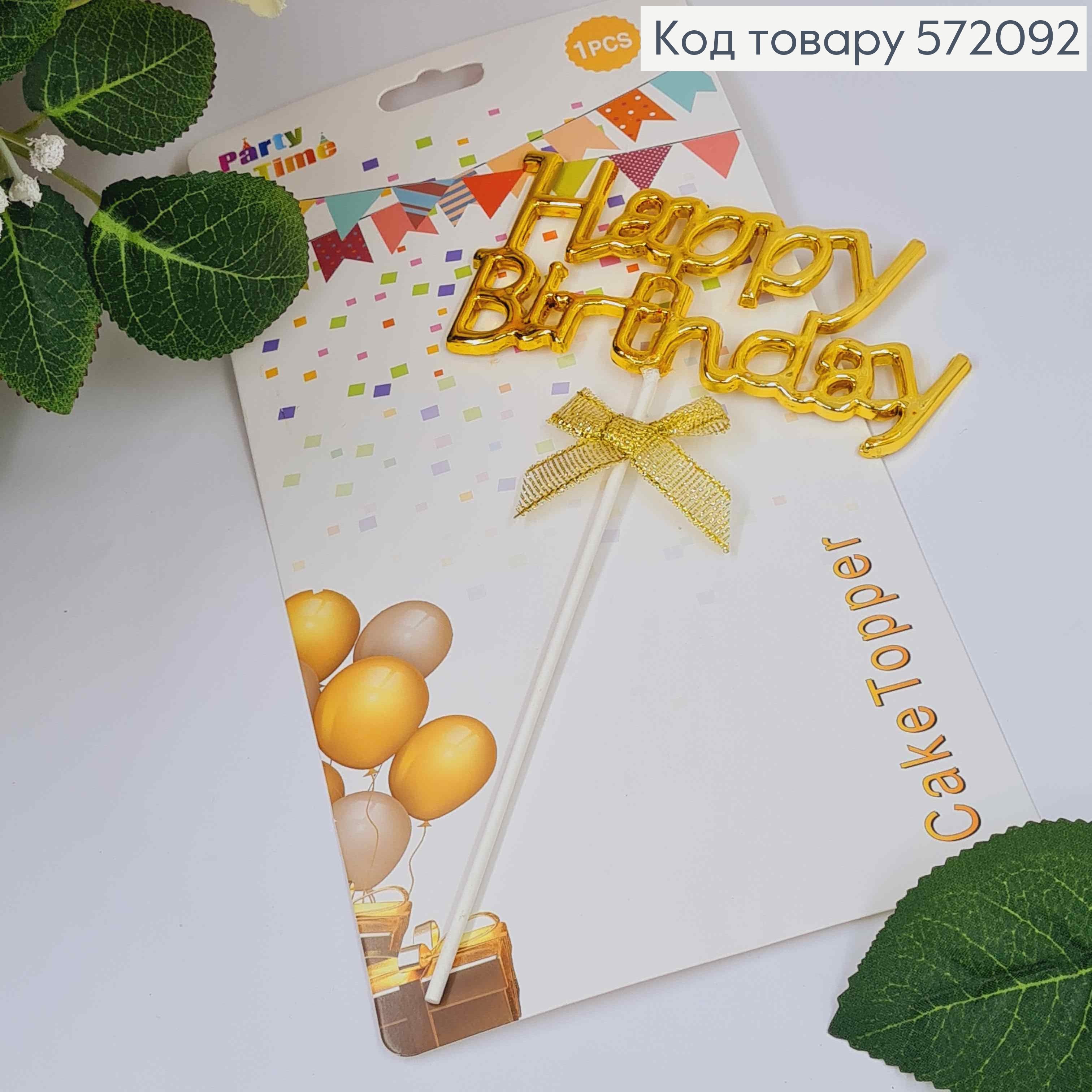 Топпер пластиковий, "Happy Birthday", Золотистого кольору, на дзеркальній основі, 16см 572112 фото