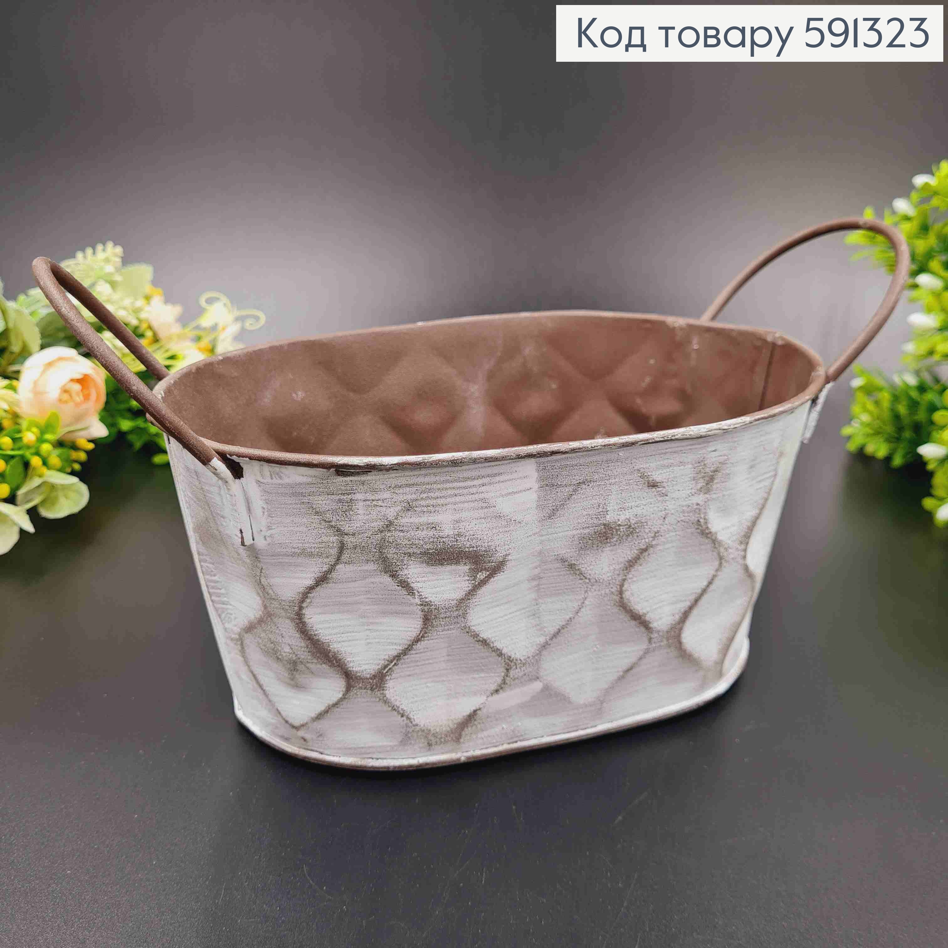 Відерце-кашпо, овальної форми, метал, білого кольору, з об'ємним візерунком, висота 9см, Польща