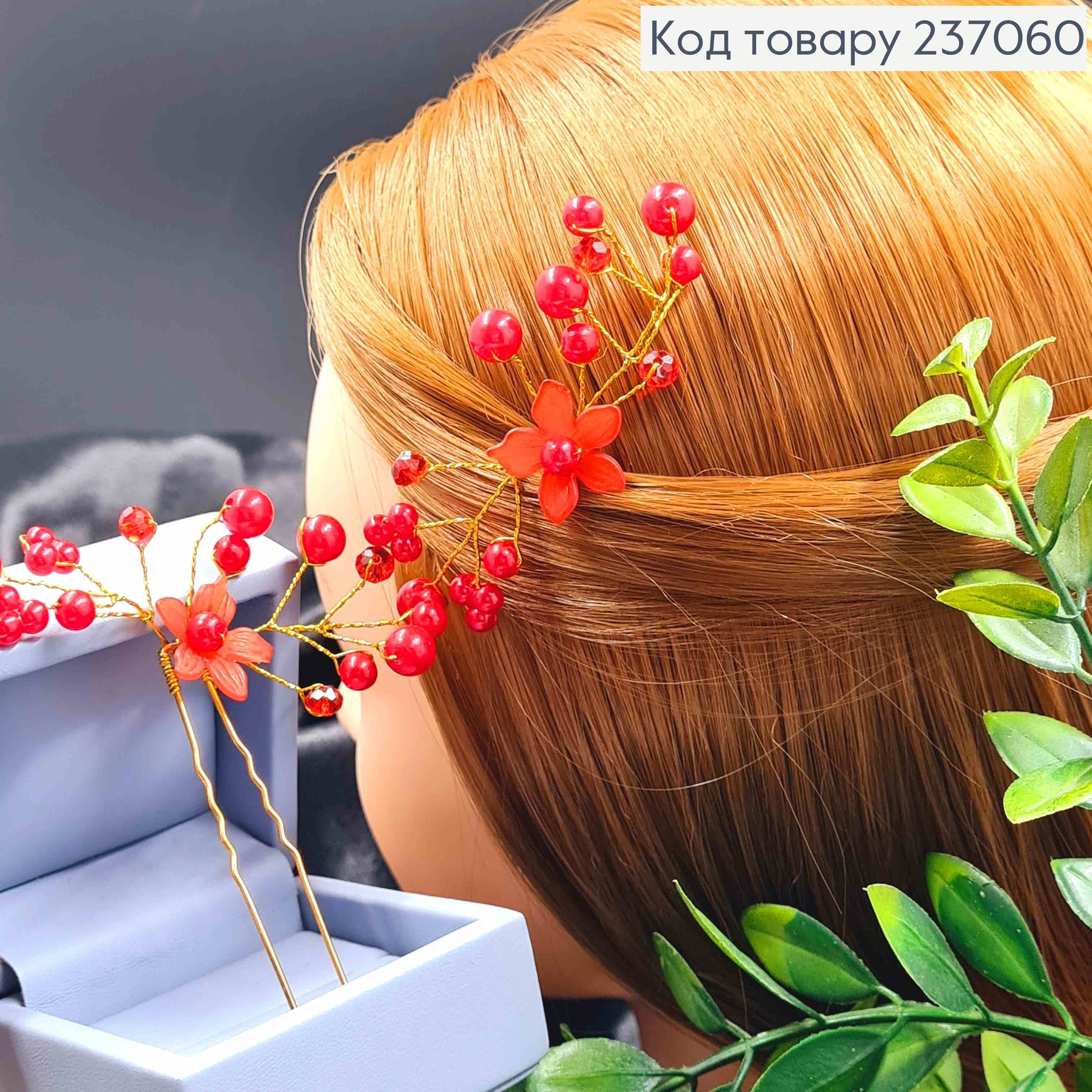 Заколка шпилька-рогач з Квіточкою та бусинками Червоного кольору, 6+4см