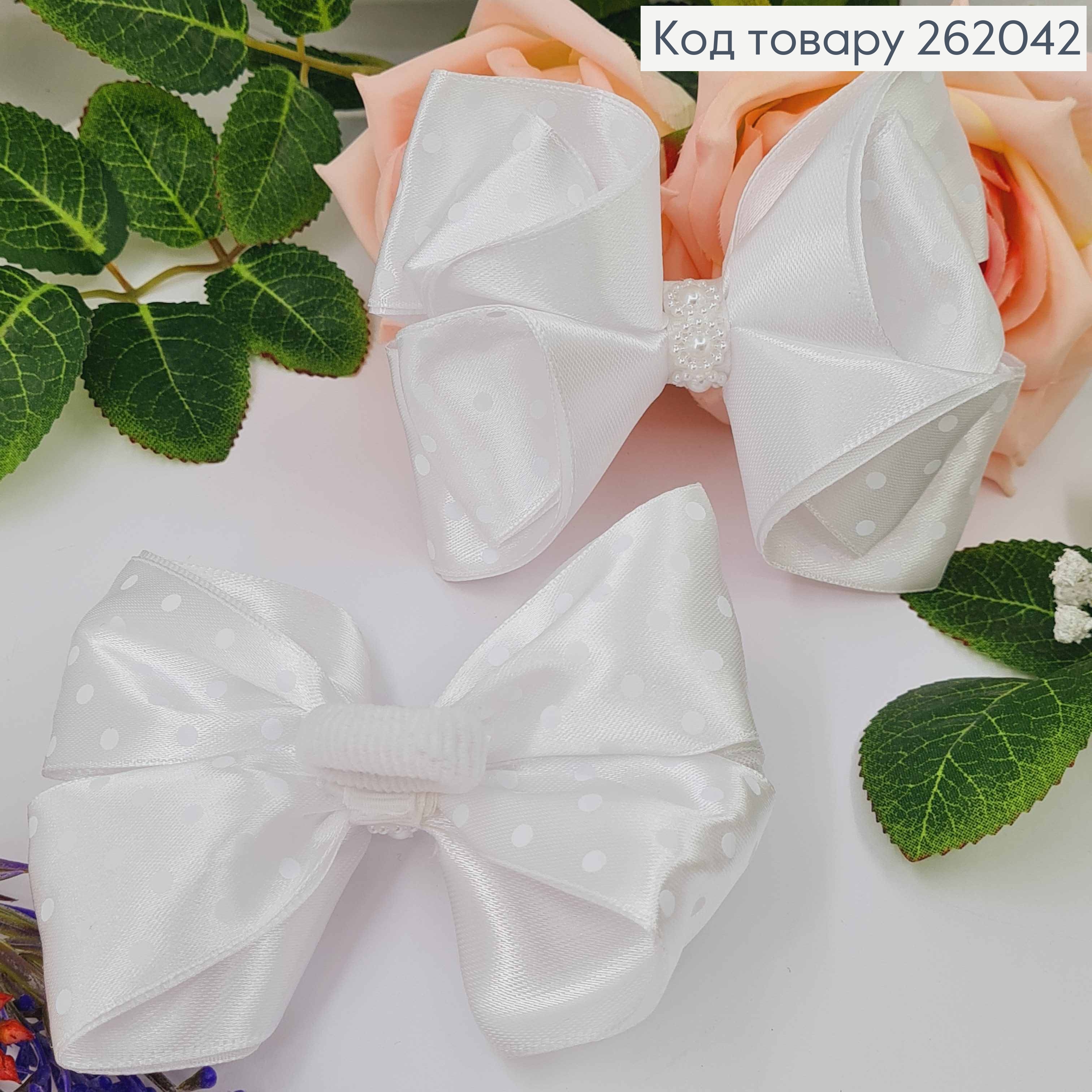 Бант БІЛОГО кольору зі стразами, на заколці 5,5, тканина атлас, розмір 10*6,5см, Україна 276163 фото