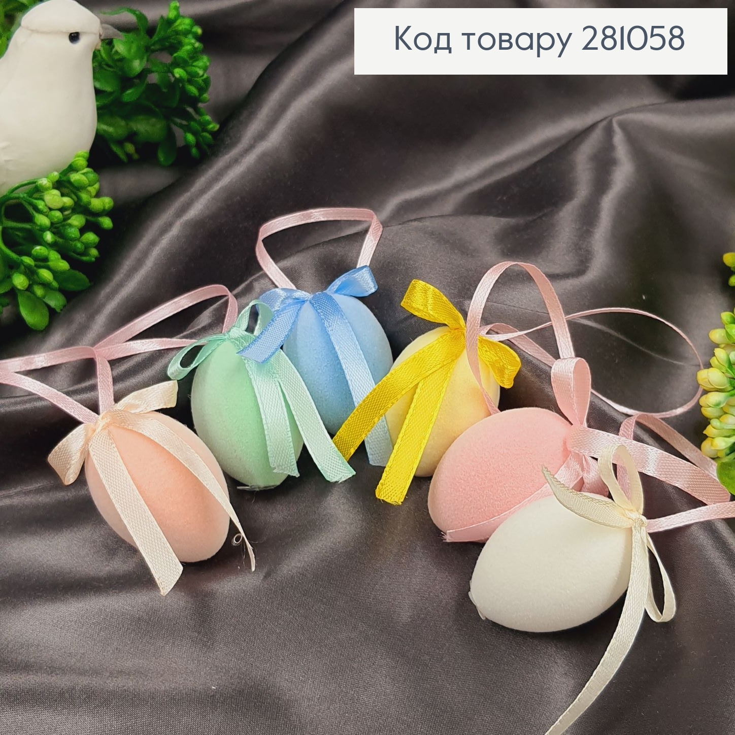 Набор Яиц (6шт/уп), РАЗНОЦВЕТНЫЕ с Пенопластовой крошкой с Бантиком на подвеске, 6*4см 282197 фото