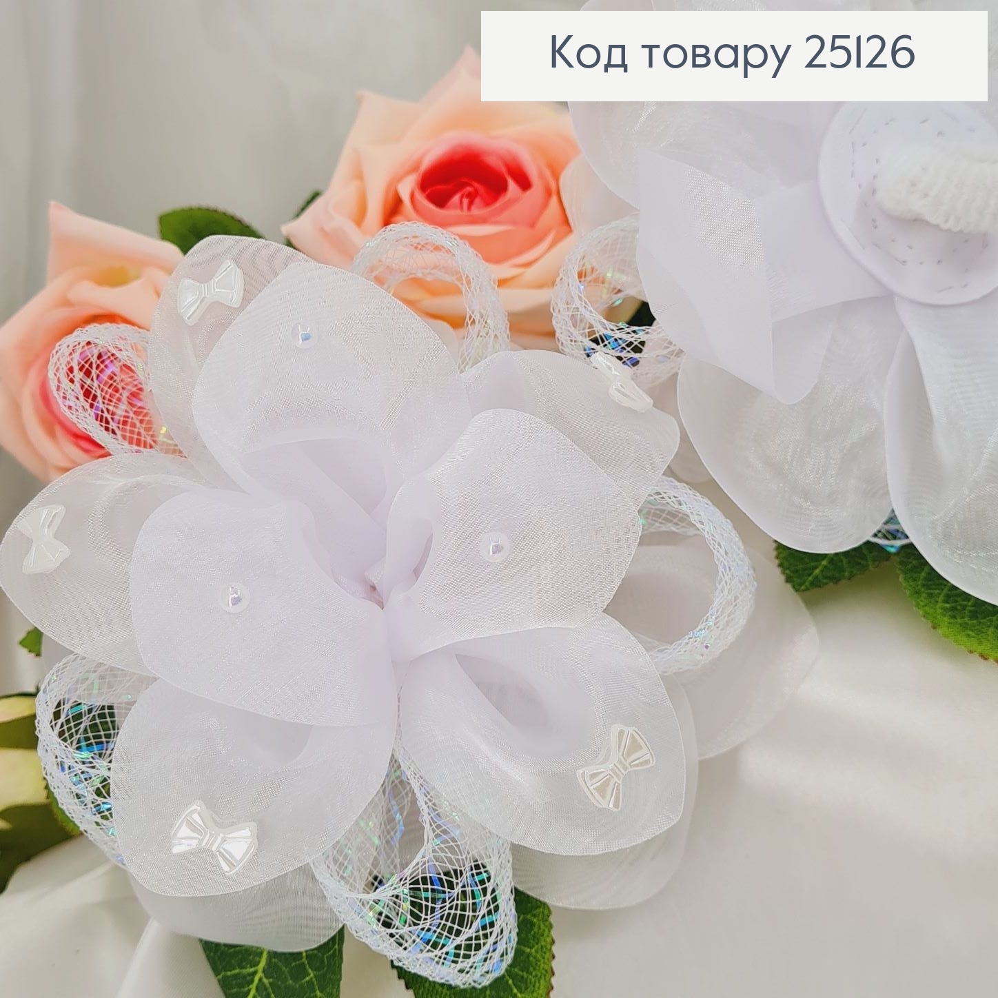 Бант атласный с бусинками, БЕЛЫЙ на резинке, размер 12*20см, ручная работа, Украина. 276166 фото