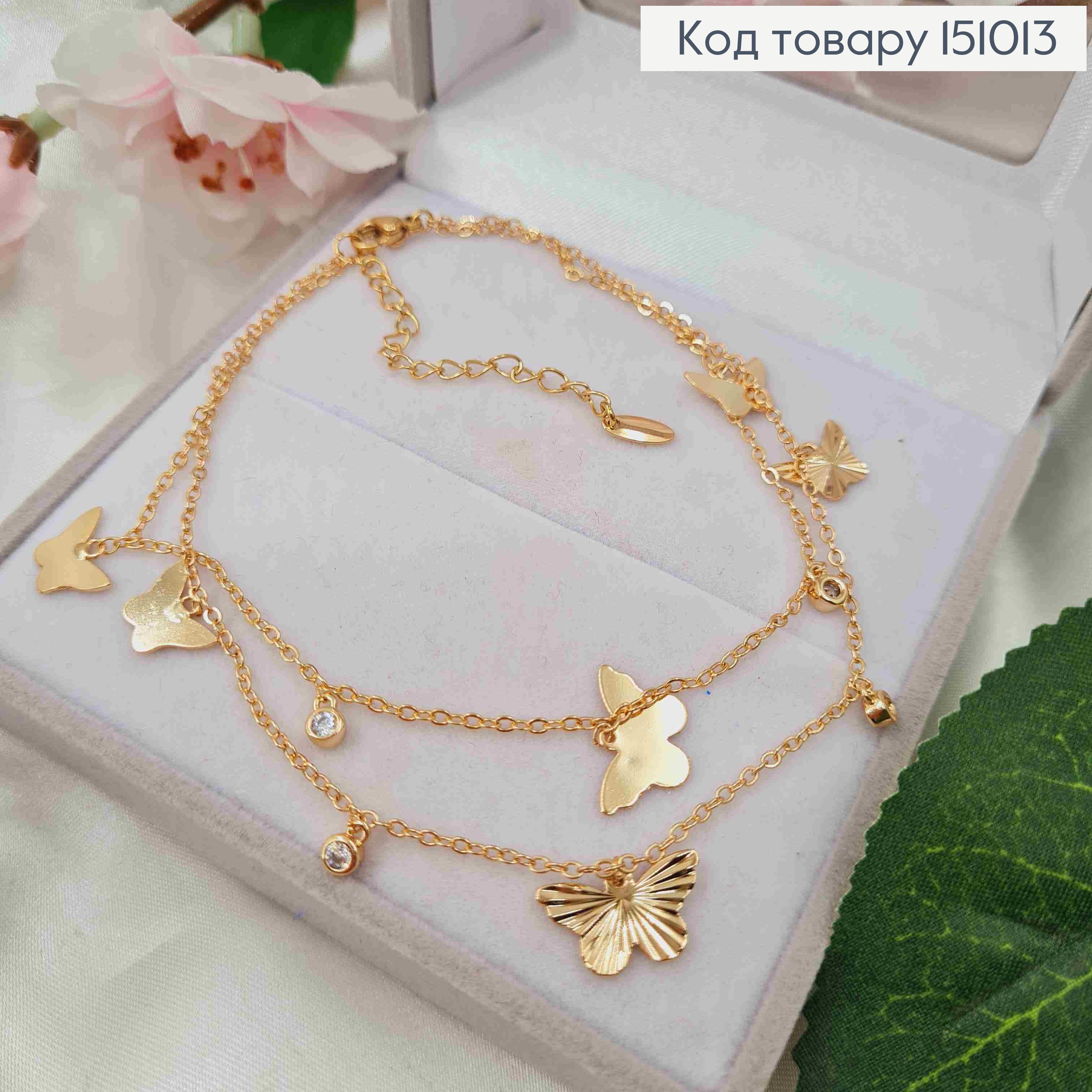 Браслет на ногу, двойной, якорное петление, Бабочка+Камешок, 23+5см, Xuping 18K