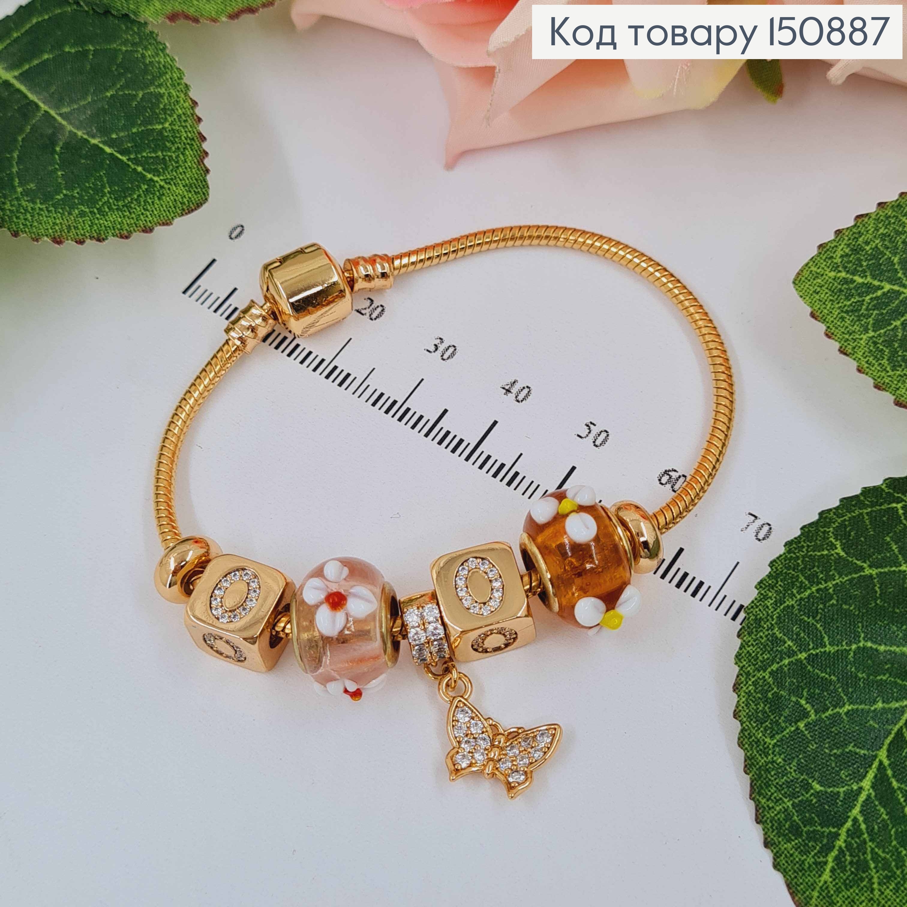 Браслет "Пандора" с розовым и оранжевым шармиком, с кубиками в камнях, длиной 18см. Xuping 18K