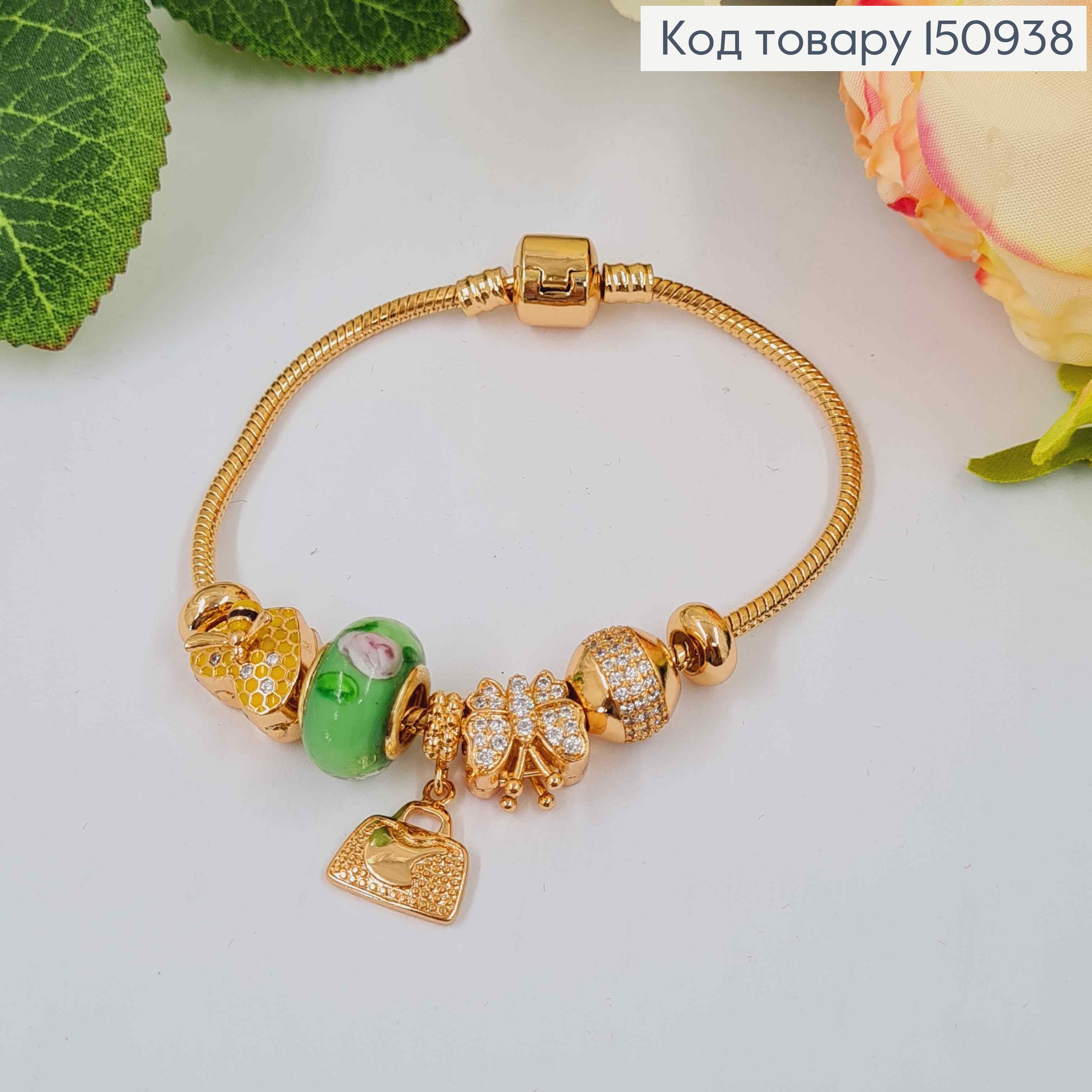 Браслет "Пандора" с зеленым шармиком с розами и розовой бабочкой, длиной 18см. Xuping 18К