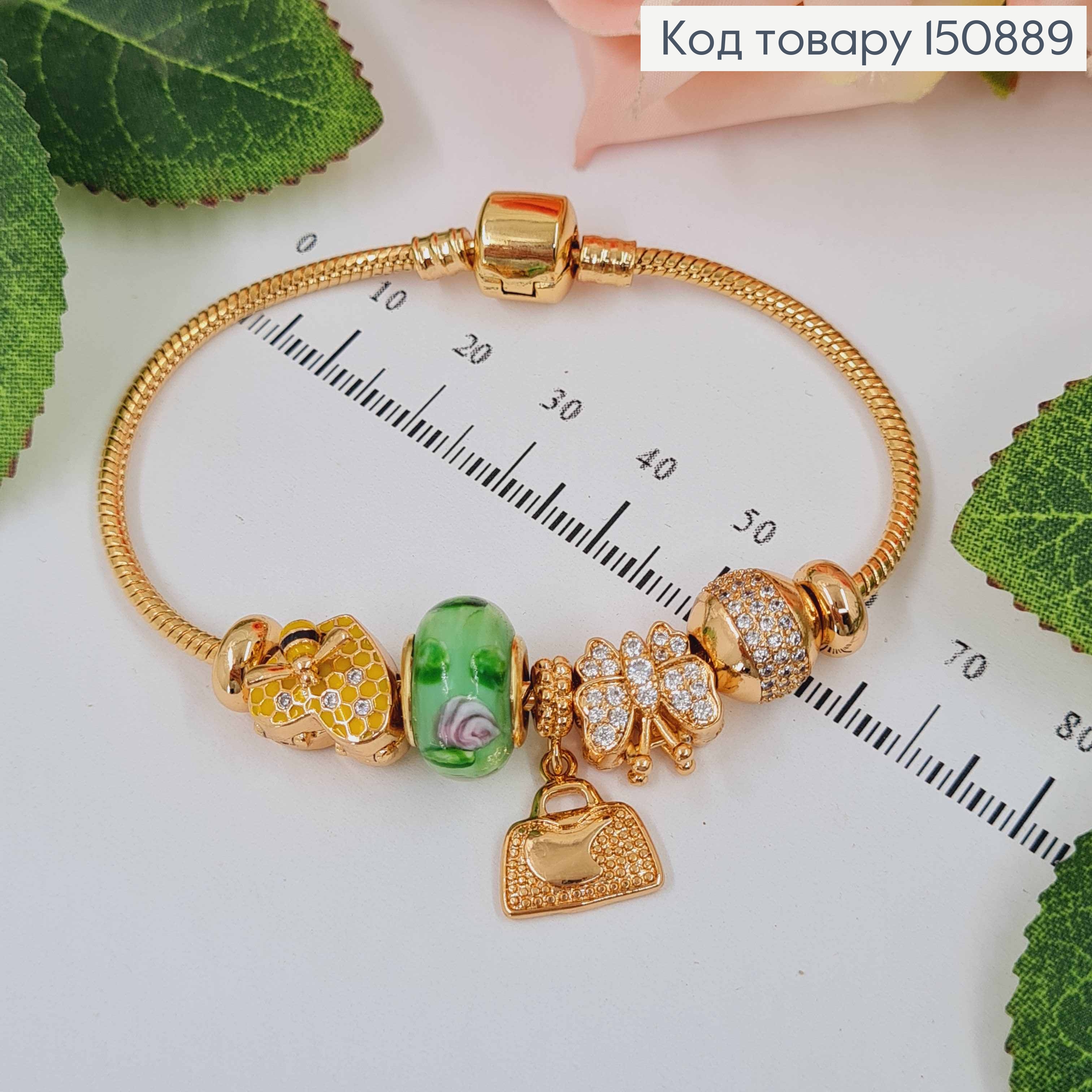 Браслет "Пандора" с Зеленым шармиком, Желтым сердечком и розовой бабочкой, длиной 18см. Xuping 18K