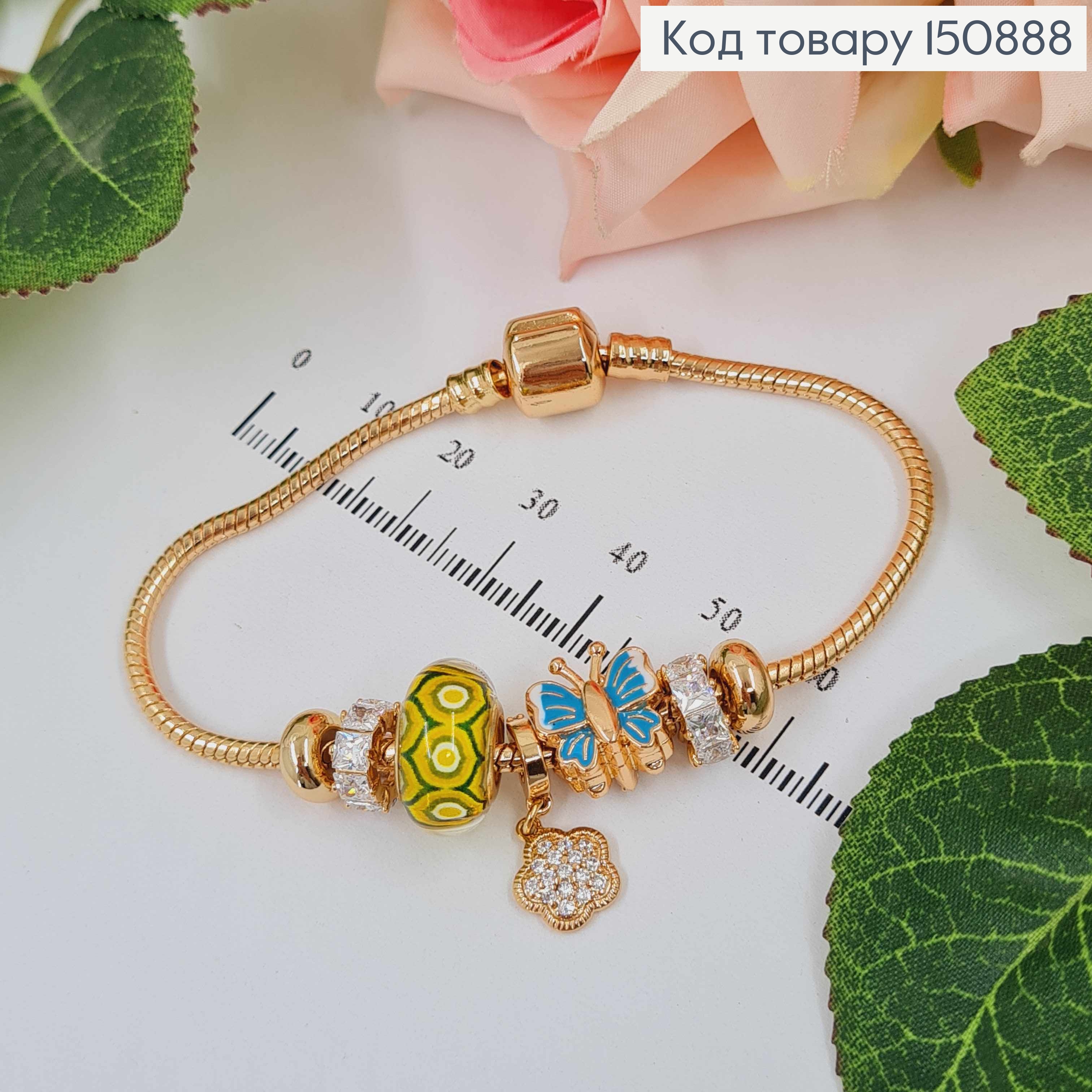 Браслет "Пандора" с желтеньким шармиком, с цветочком и голубой бабочкой, длиной 18см. Xuping 18K
