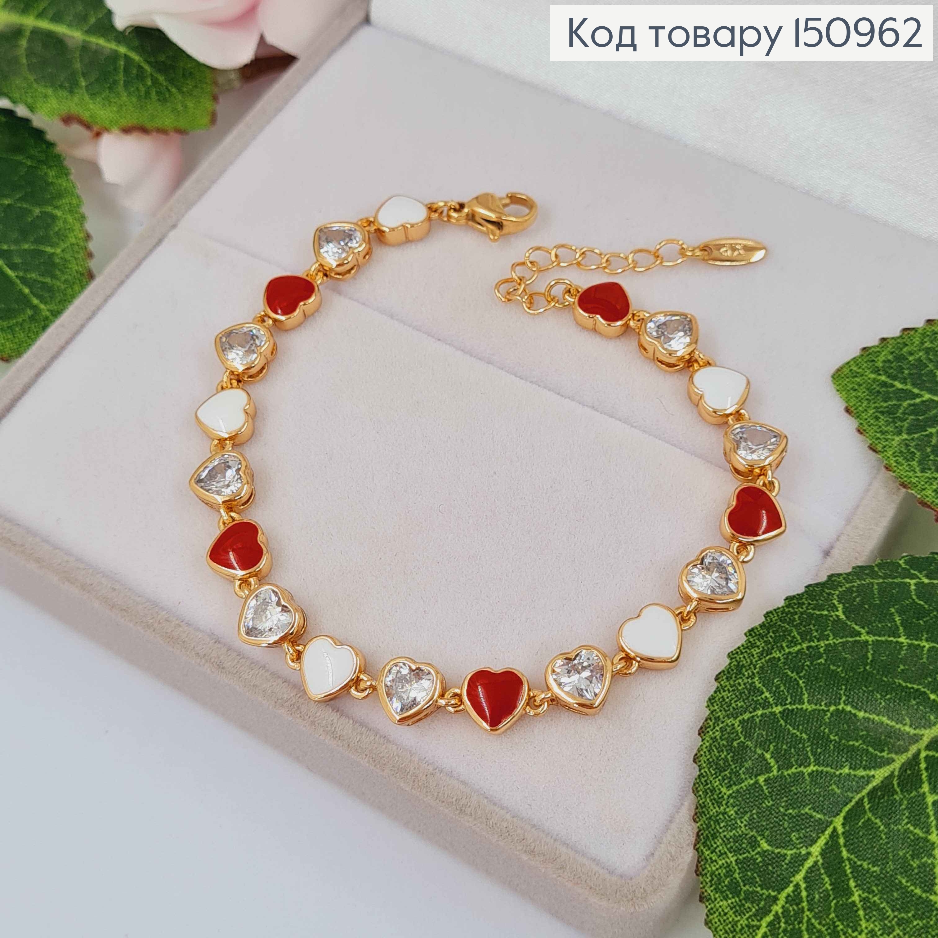 Браслет "Сердца трех" с белым, красным и прозрачным камнем 17+3см, Xuping 18K