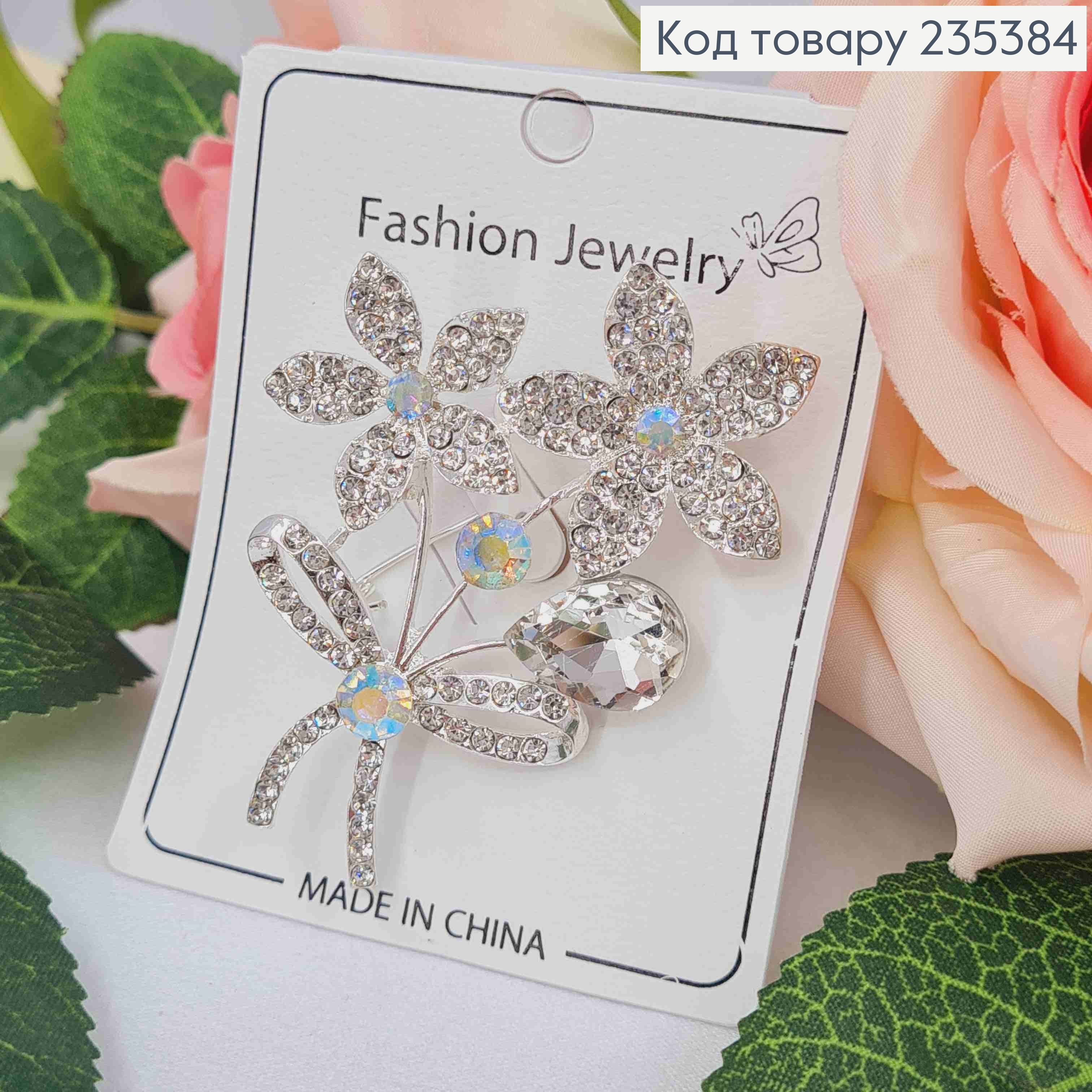 Брошь, "Букетик Цветов" с Блестящими камешками, 6см, Серебряного цвета