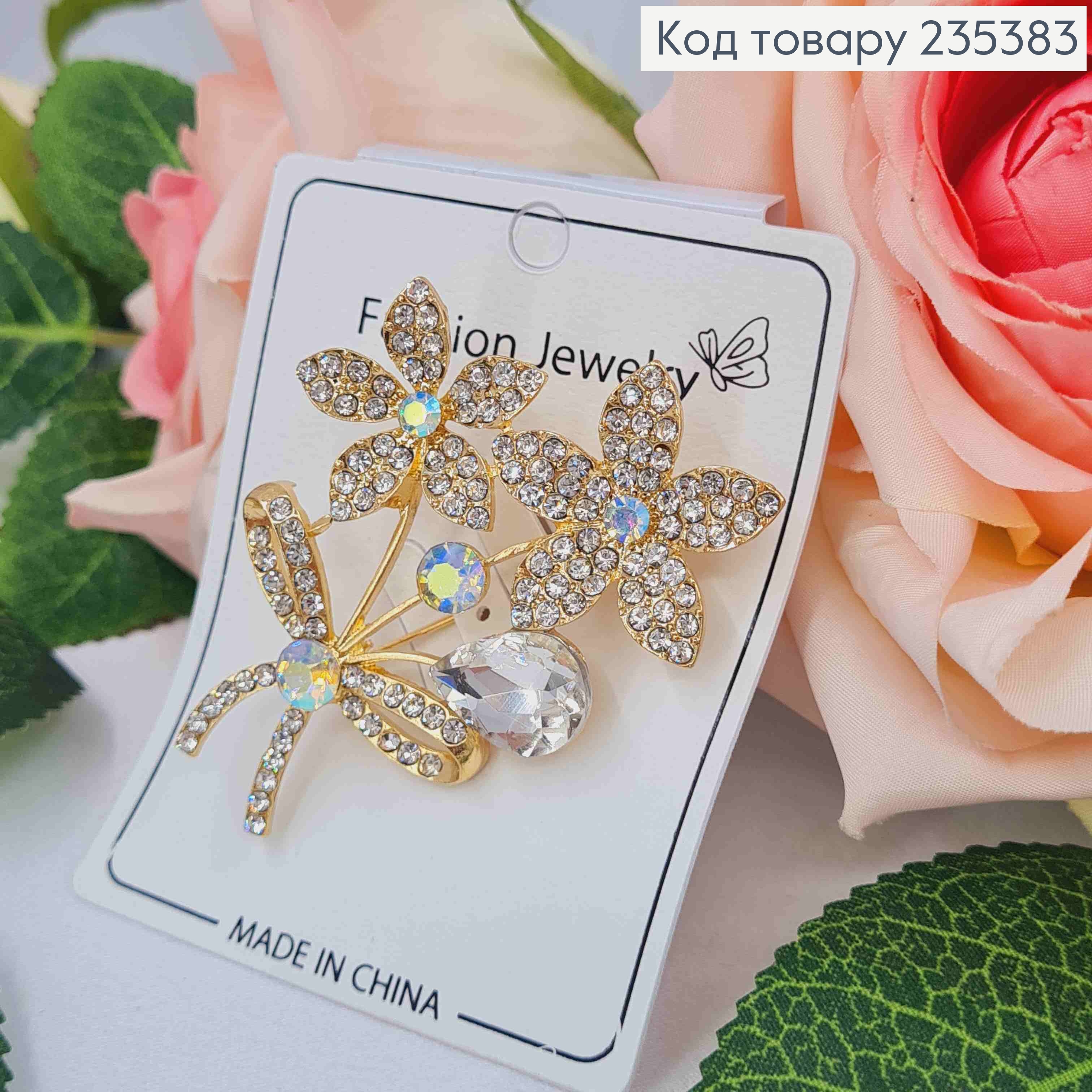Брошь, "Букетик Цветов" с Блестящими камешками, 6см, Золотого цвета