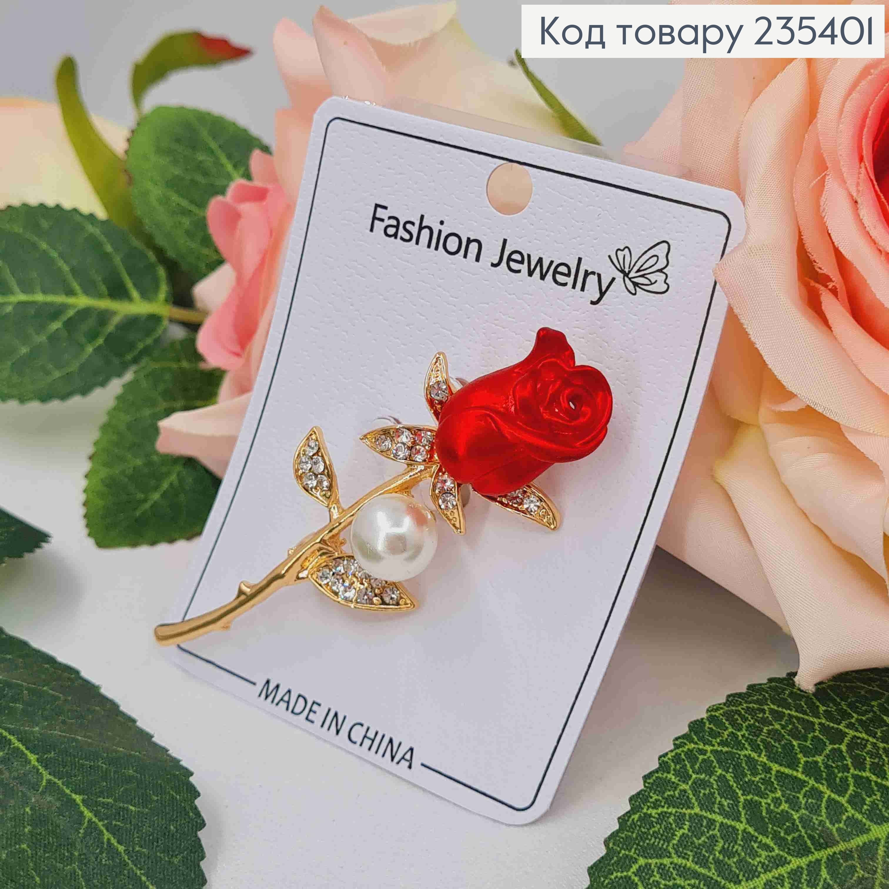 Брошь, "Красная Роза" с Блестящими камешками и Жемчужкой, 6,5см, Золотого цвета