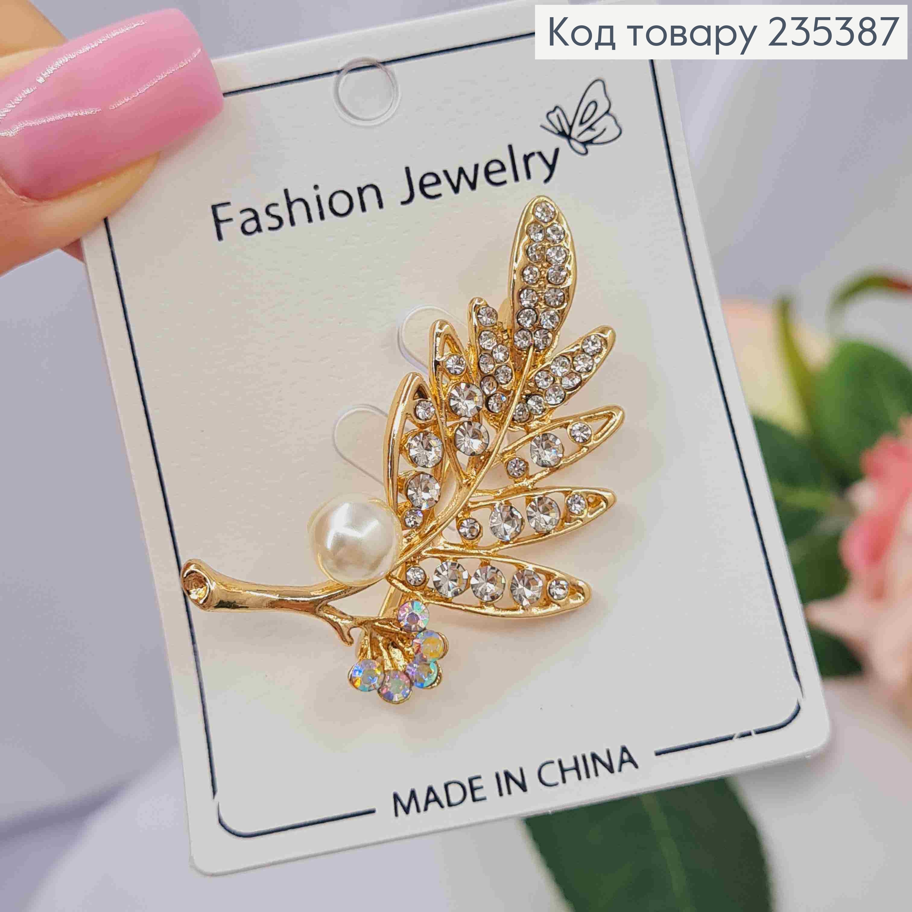 Брошь, "Веточка Папоротника" с Блестящими камешками и Жемчужкой, 5см, Золотого цвета
