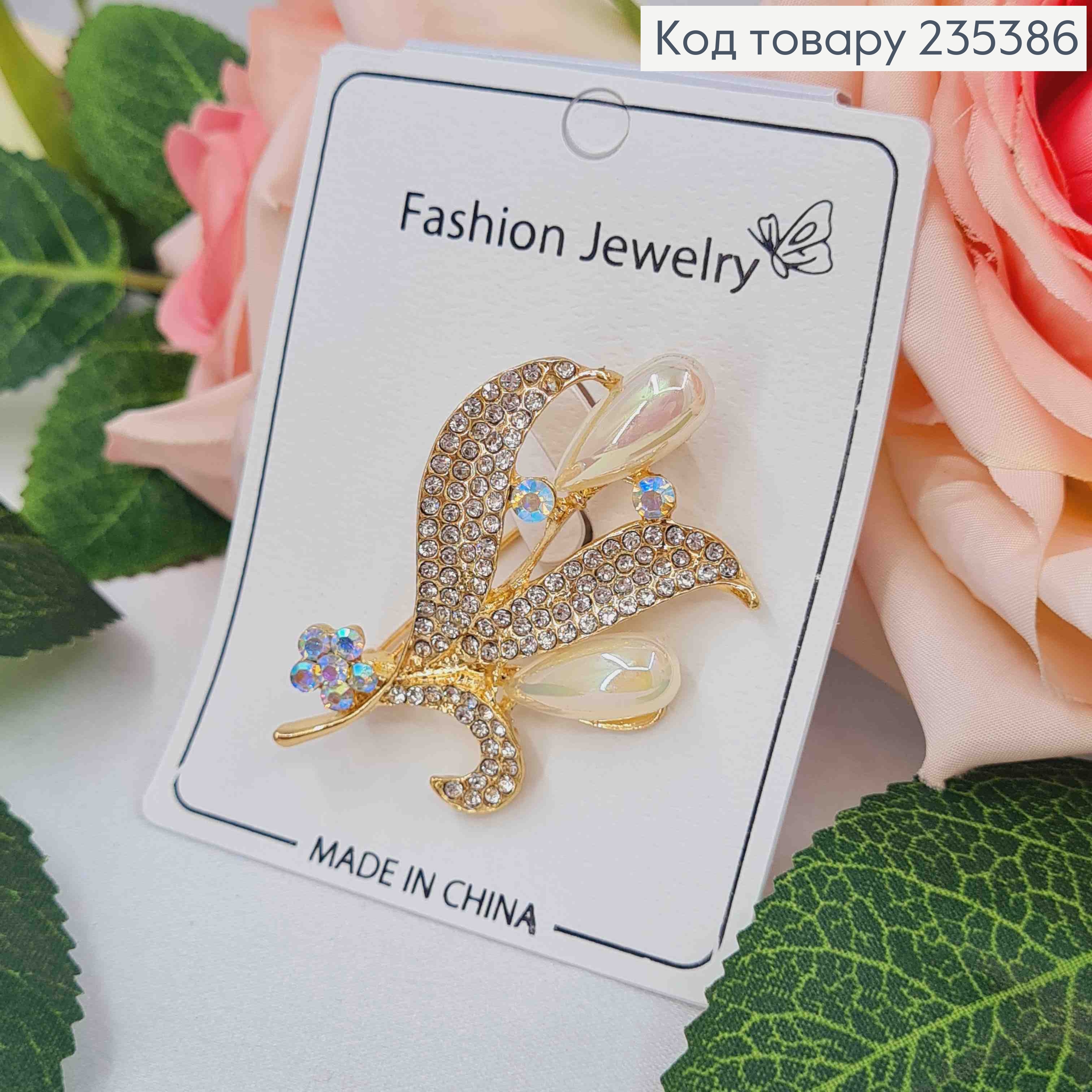 Брошь металл "СТРЕКОЗА" украшена Блестящими камешками и Перламутровой, 5,5*4см, Золотого цвета 235524 фото