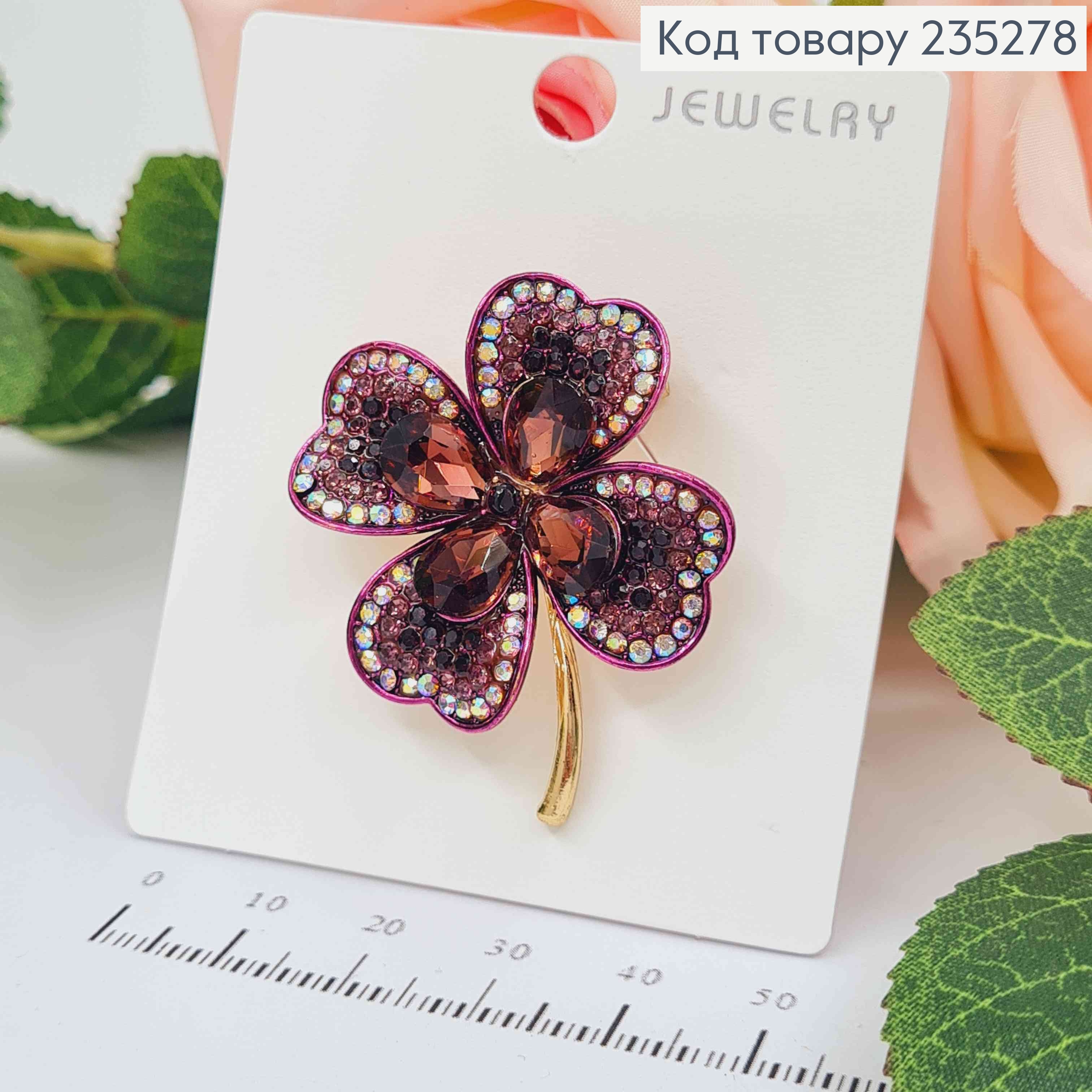 Брошь Клевер с камешками цвета ФУКСИЯ 3*4см