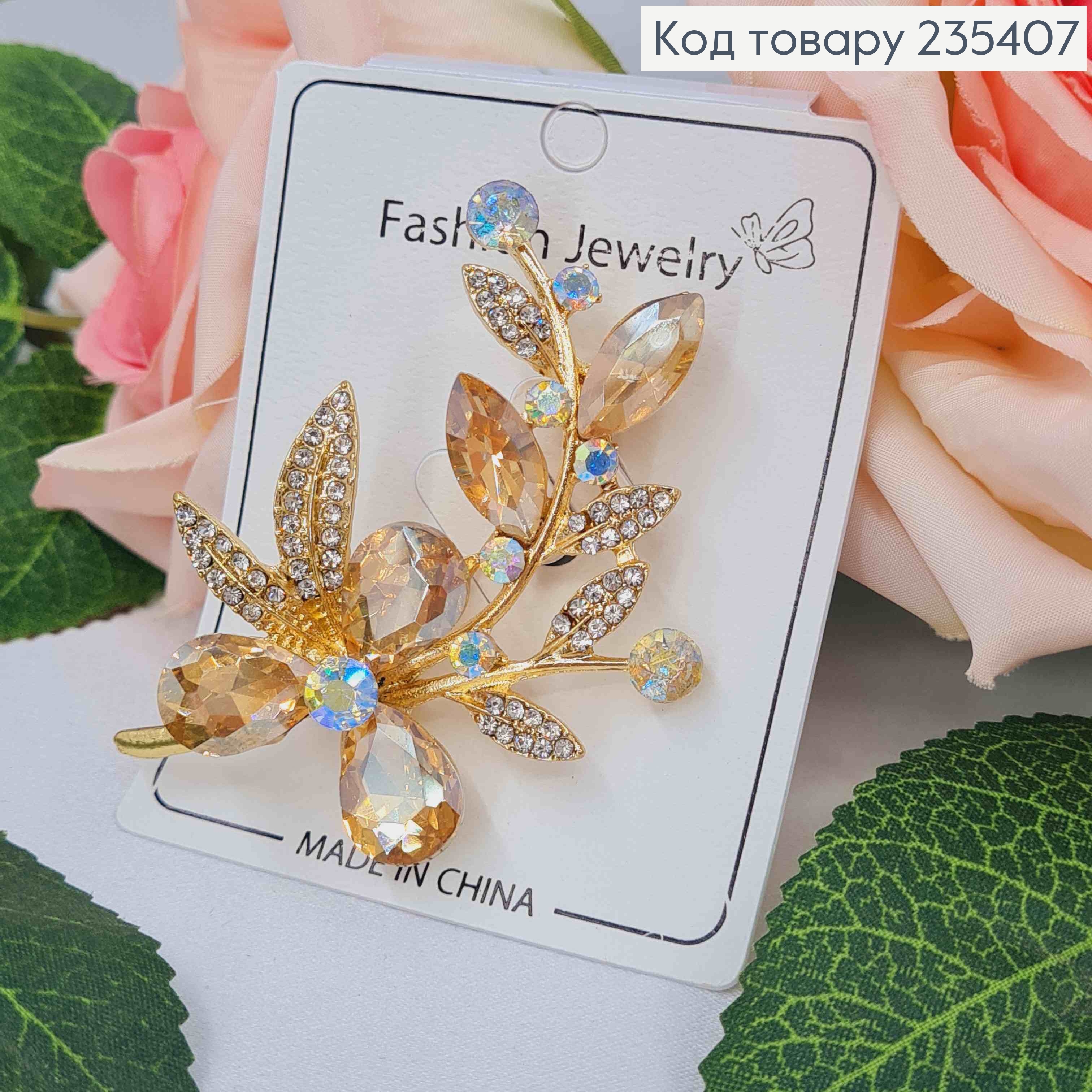 Брошь, "Цветок на веточке" с кремовыми камешками, 6,5см, Золотого цвета