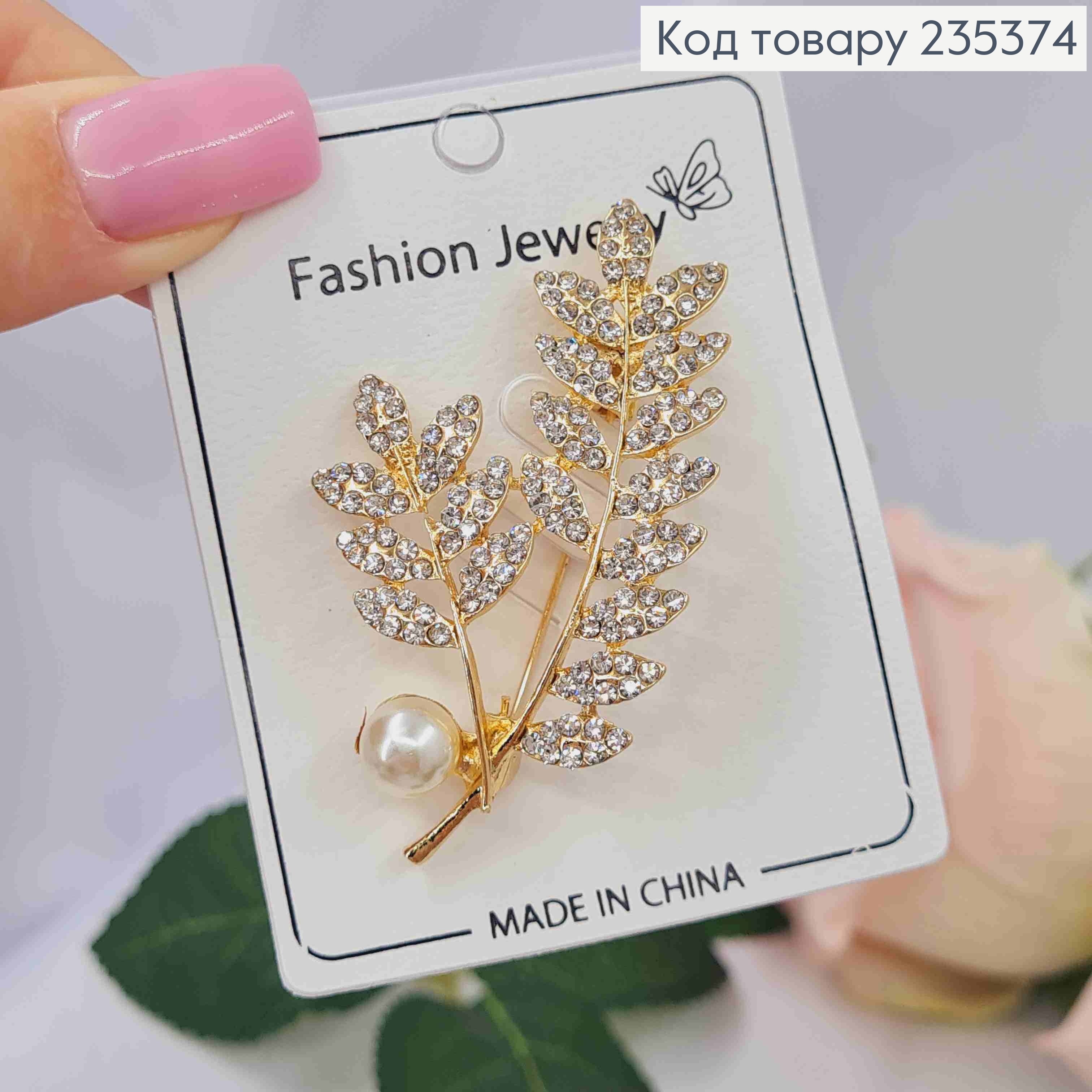 Брошь, "Листья Папоротника" с Блестящими камешками и Жемчужкой, 6см, Золотого цвета