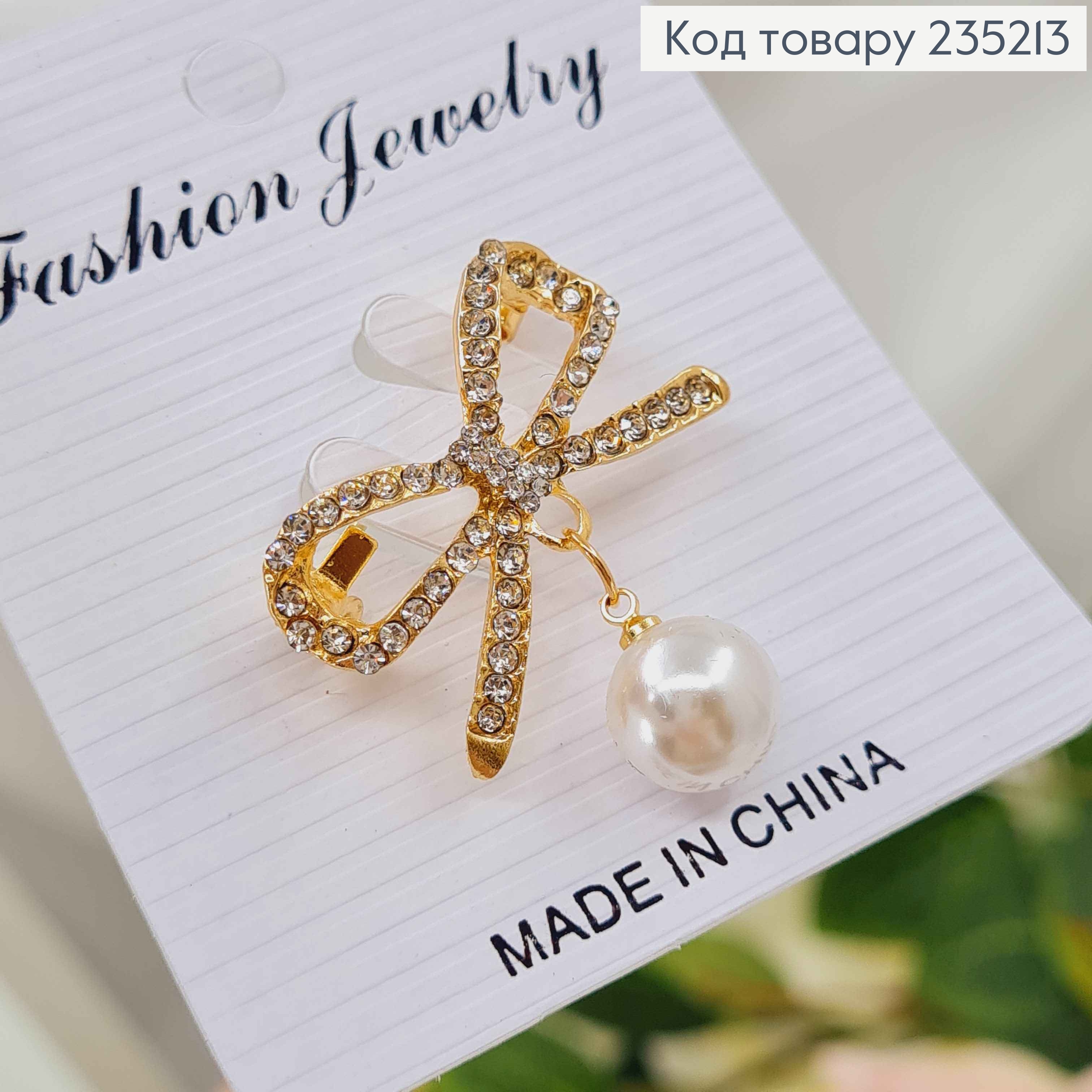 Брошь металл "Бантик" золотого цвета, в камешках, с жемчужиной 3см