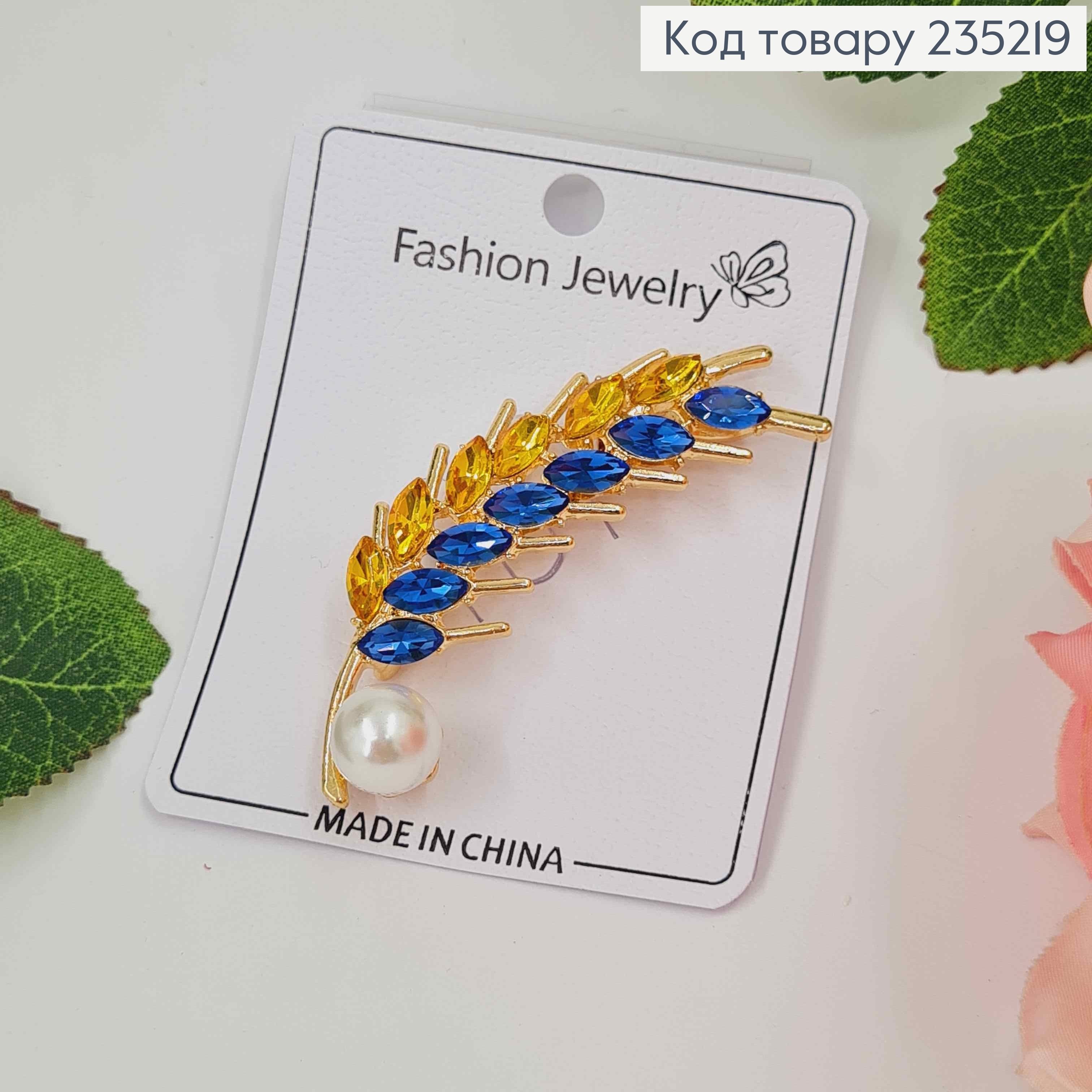 Брошь металл, Колосок с сине-желтыми камешками, с жемчужиной, 6см.