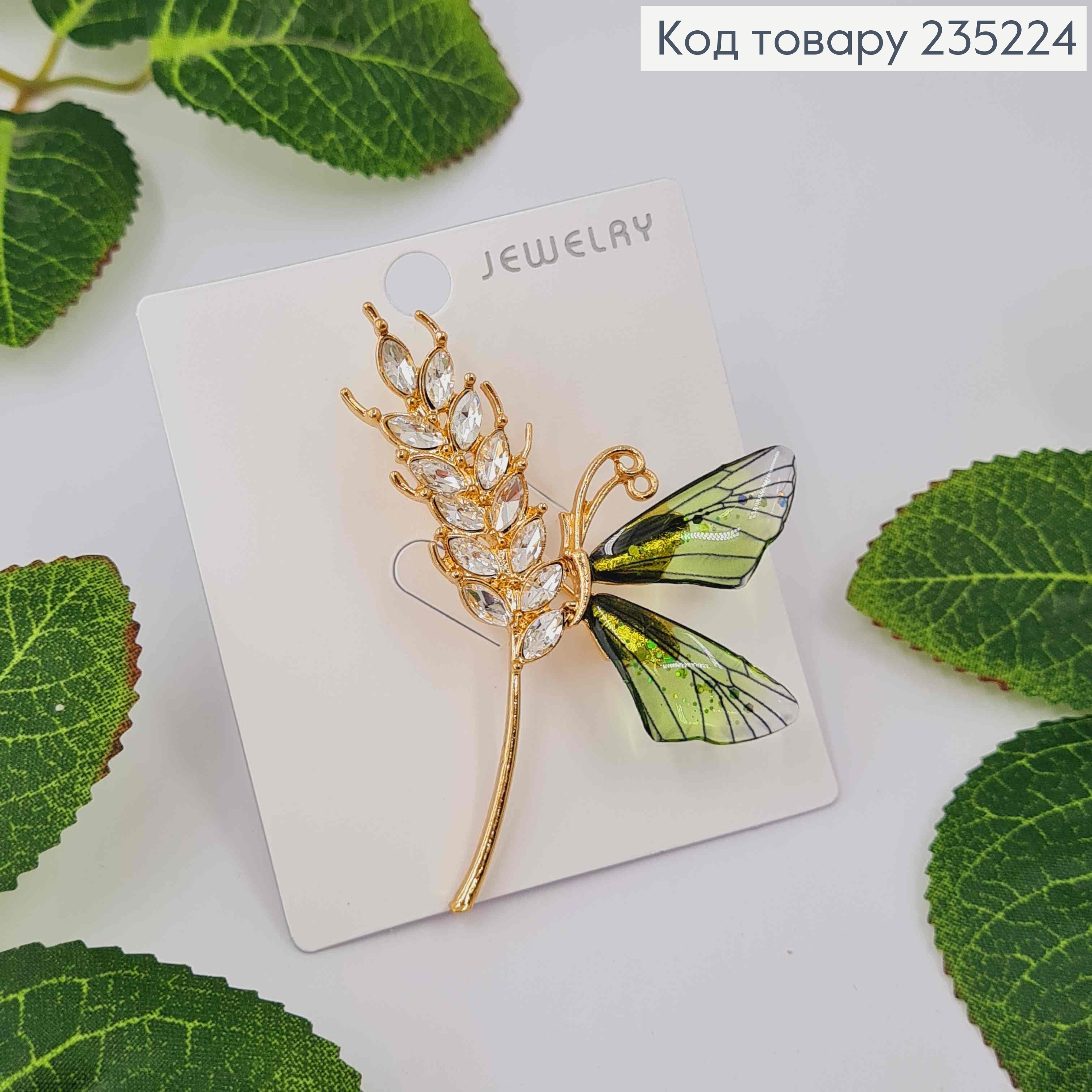 Брошь металл, Бабочка с зелеными крыльями, на Колоске в камнях, 6,5см