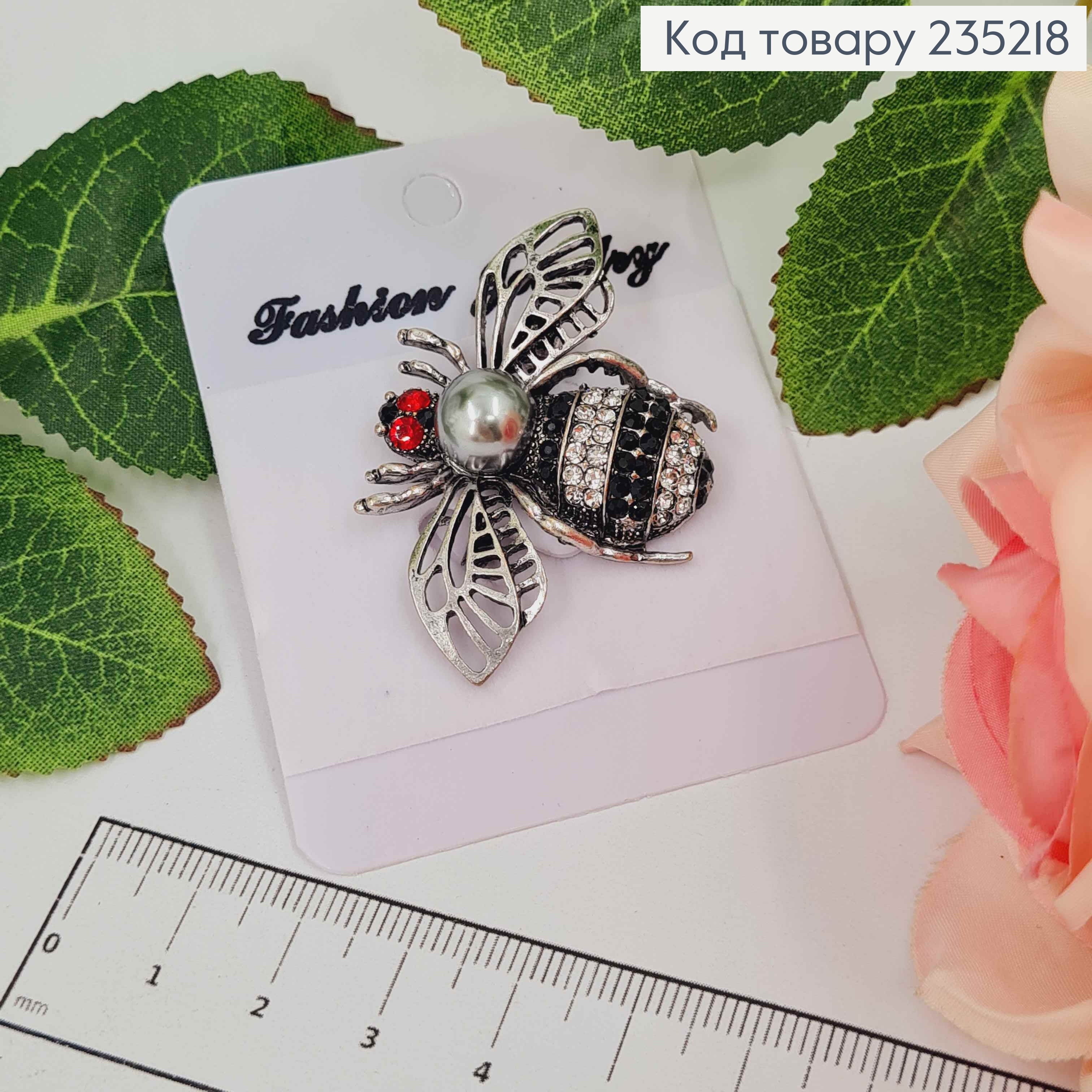 Брошь металл Муха серебро с белыми камешками 5х3,5см