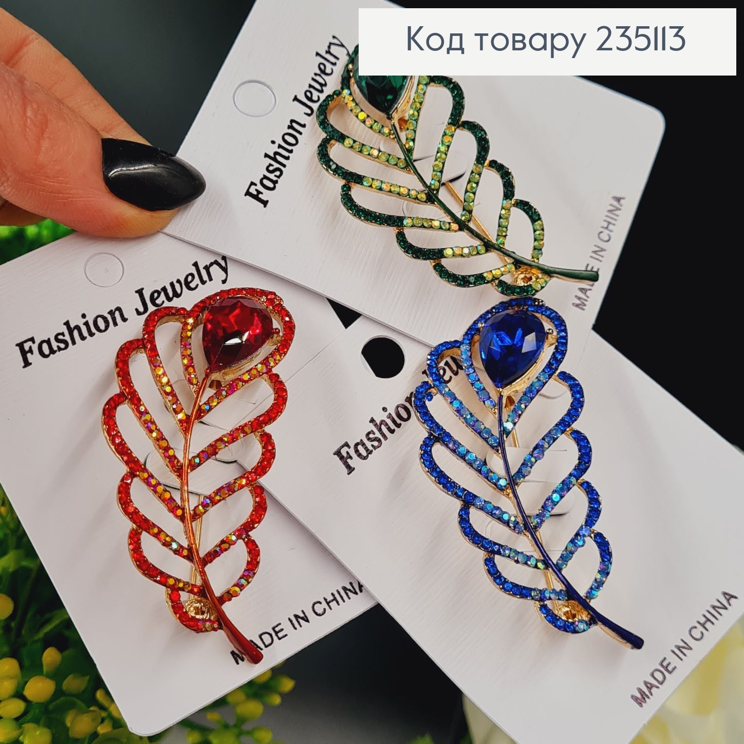 Брошь металл Перышко с камнями в асс.