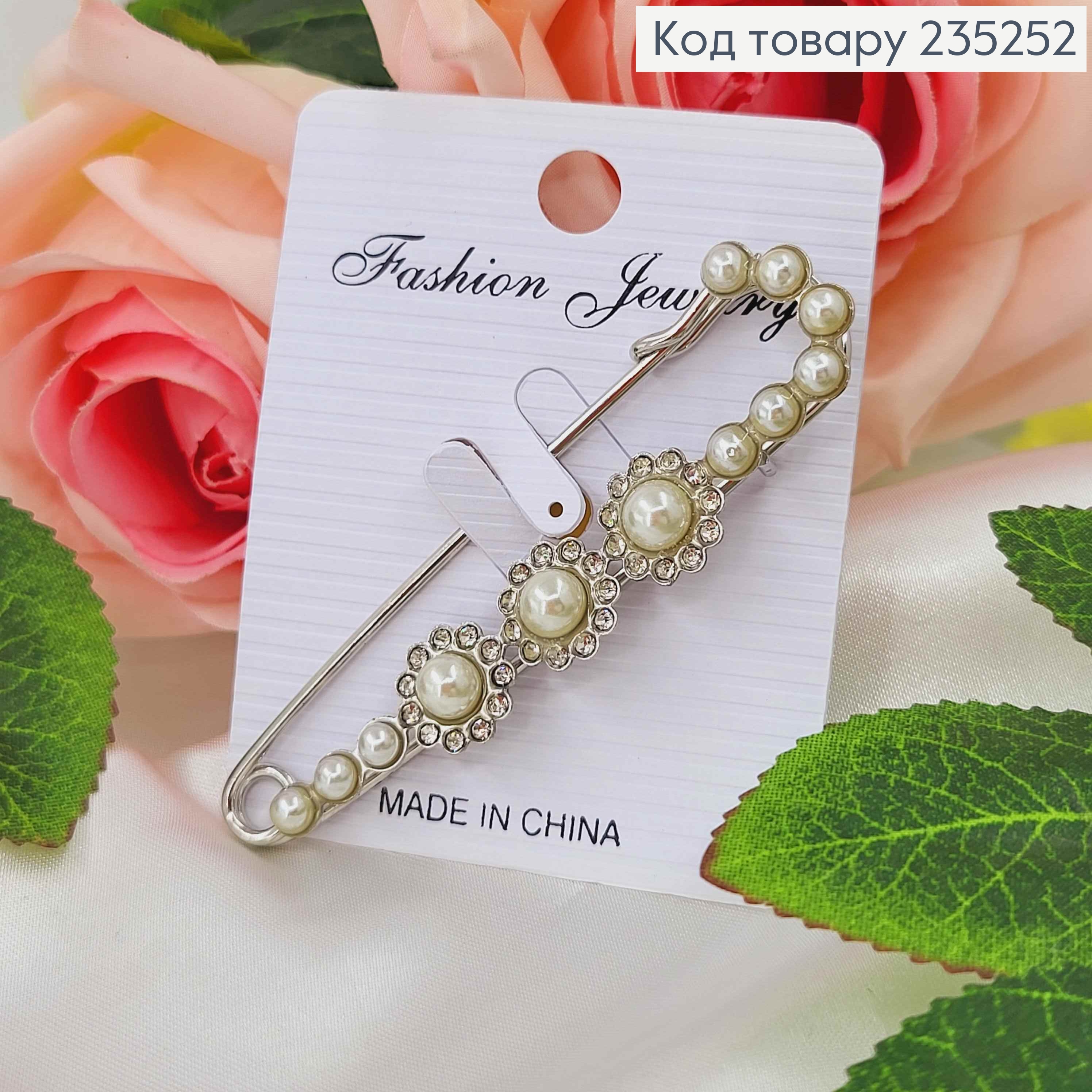 Брошь металл, Булавка серебряного цвета, три цветочка, в жемчужинах 7,5см