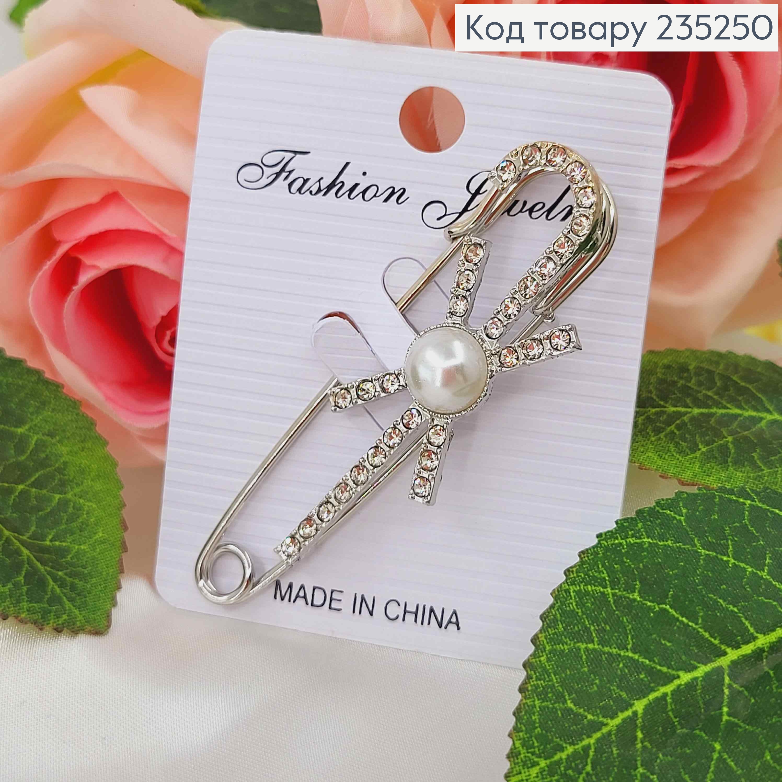 Брошь металл, Булавка серебряного цвета, в камешках с жемчужиной 7см