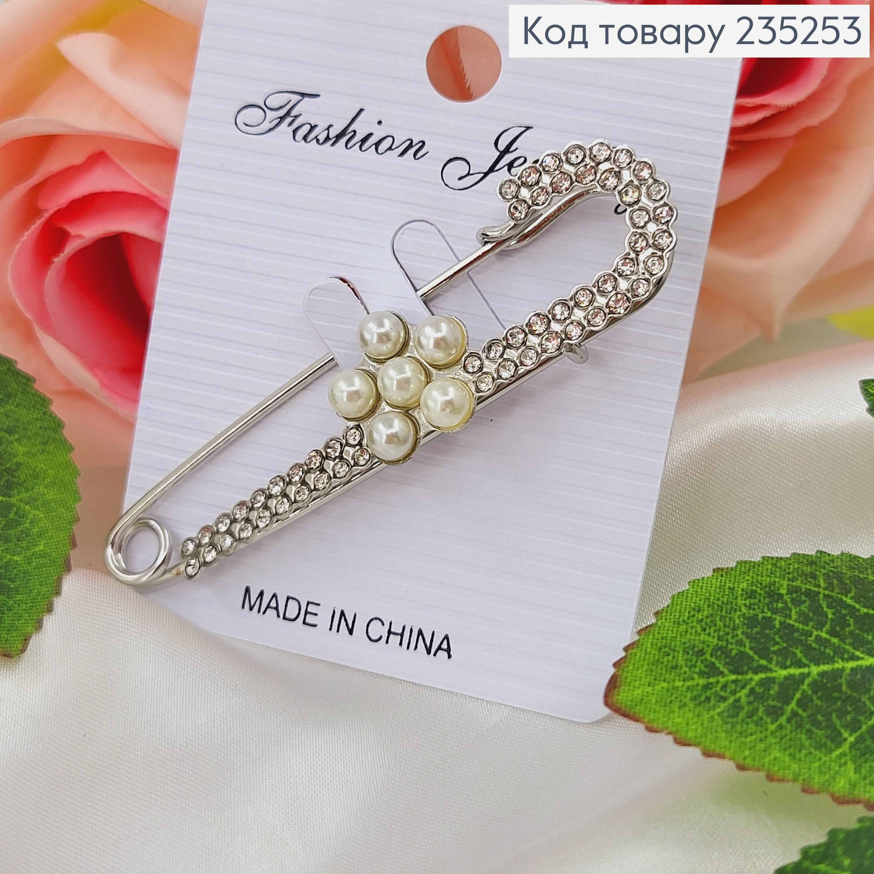 Брошь металл, Булавка серебряного цвета, с цветком, в камнях 7,5см
