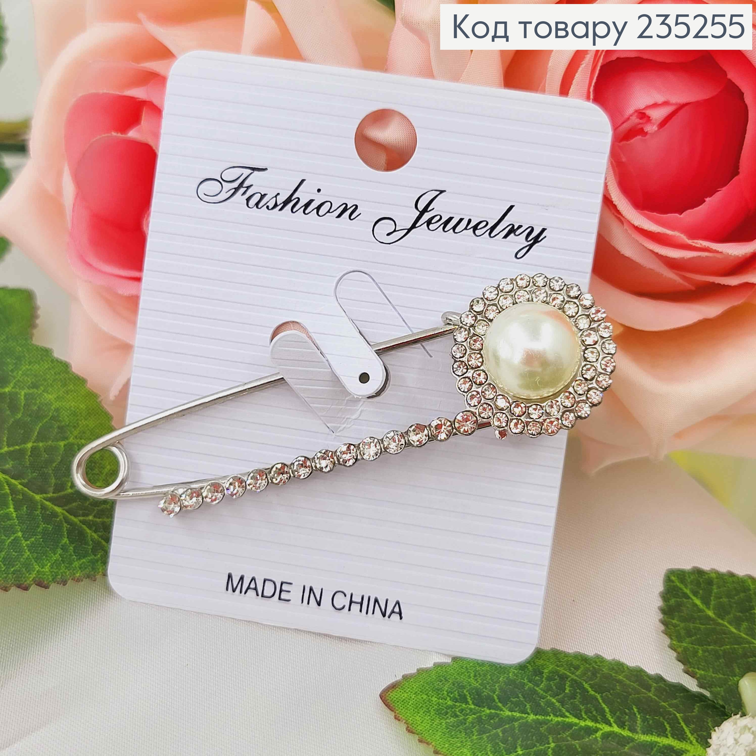 Брошь металл, Булавка серебряного цвета, с большой жемчужиной, с камнями, 7см