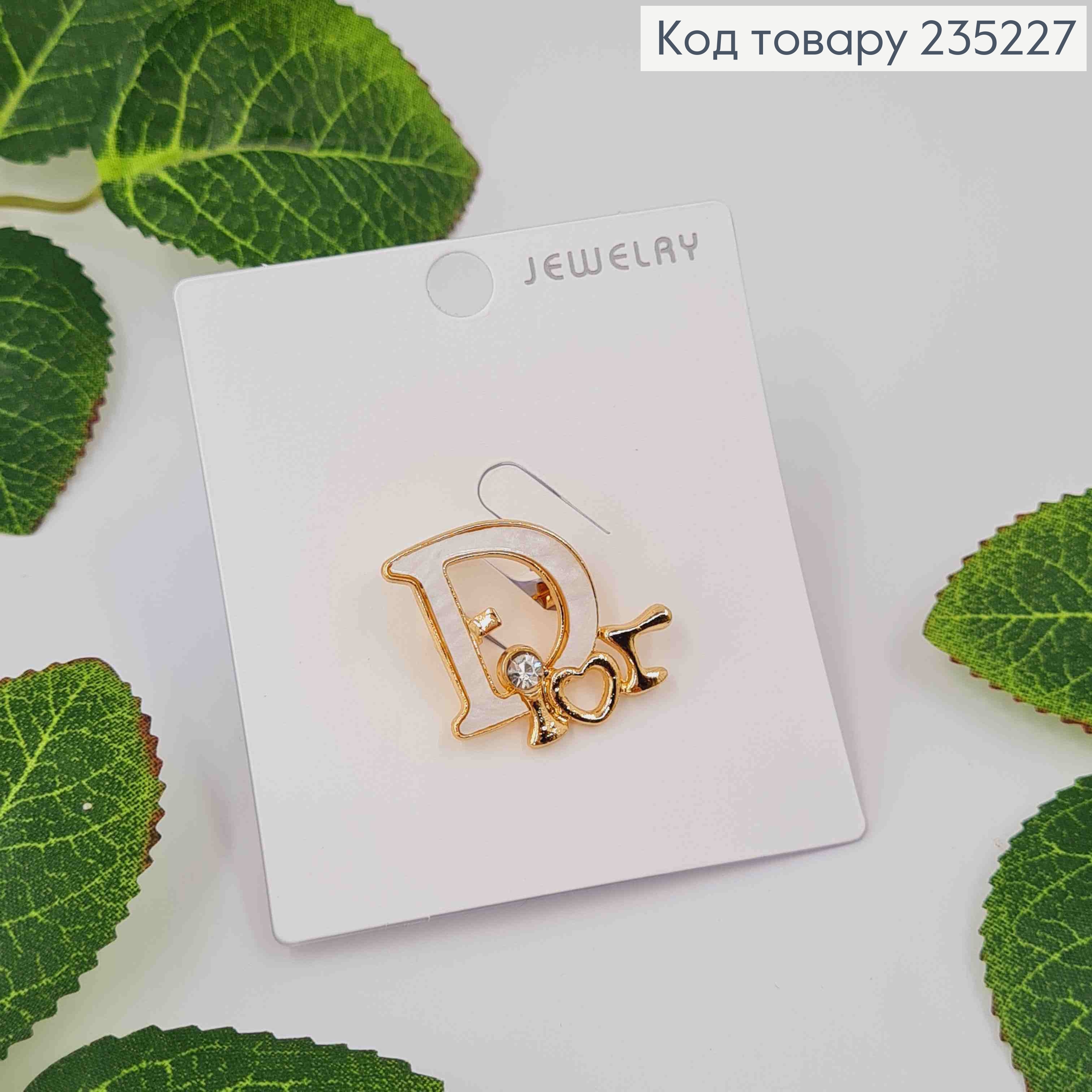 Брошь металл, золотого цвета, "Диор" с белой эмалькой и камнем, 2,5см.