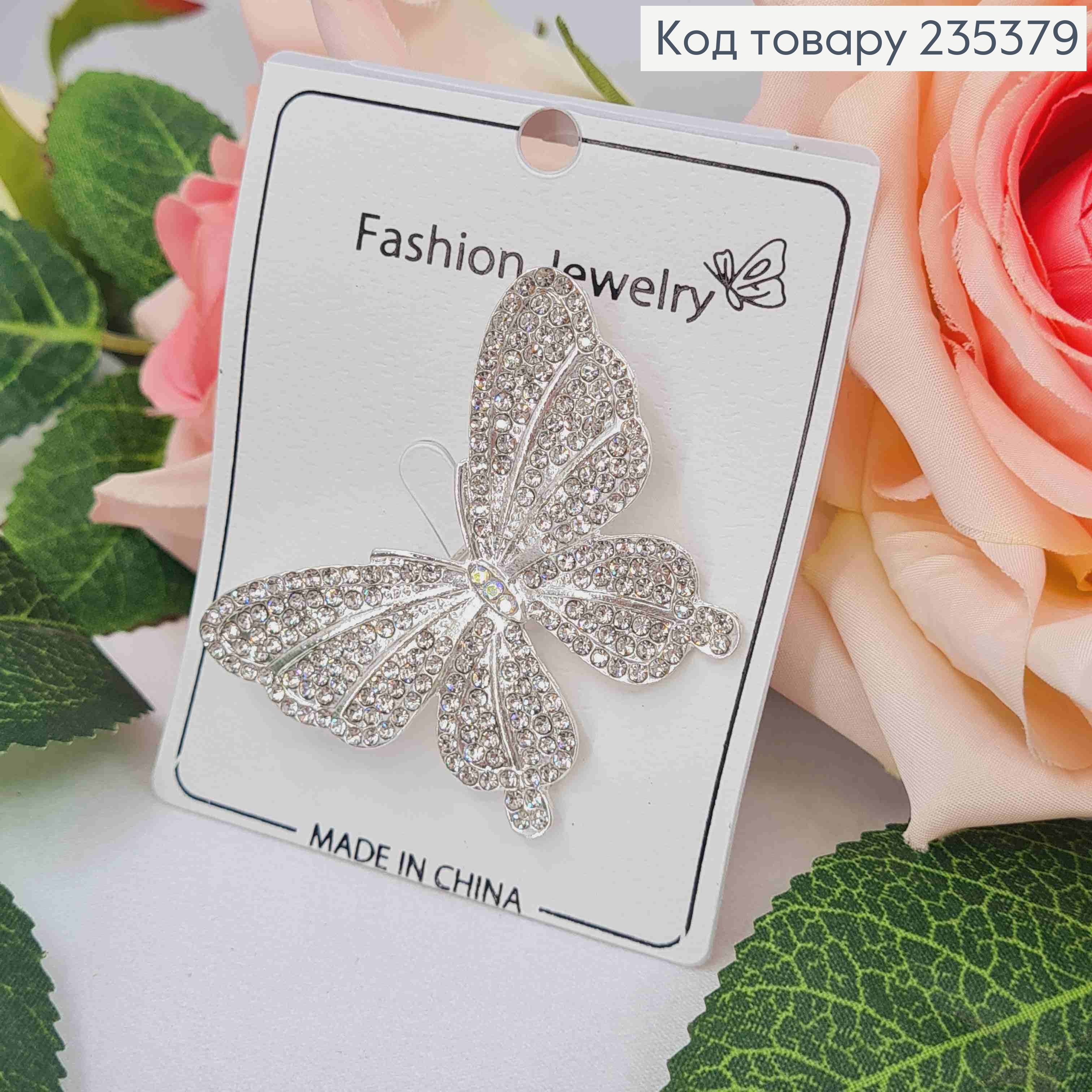 Брошь, "Бабочка" украшена Блестящими камешками, 4,8см, Серебряного цвета
