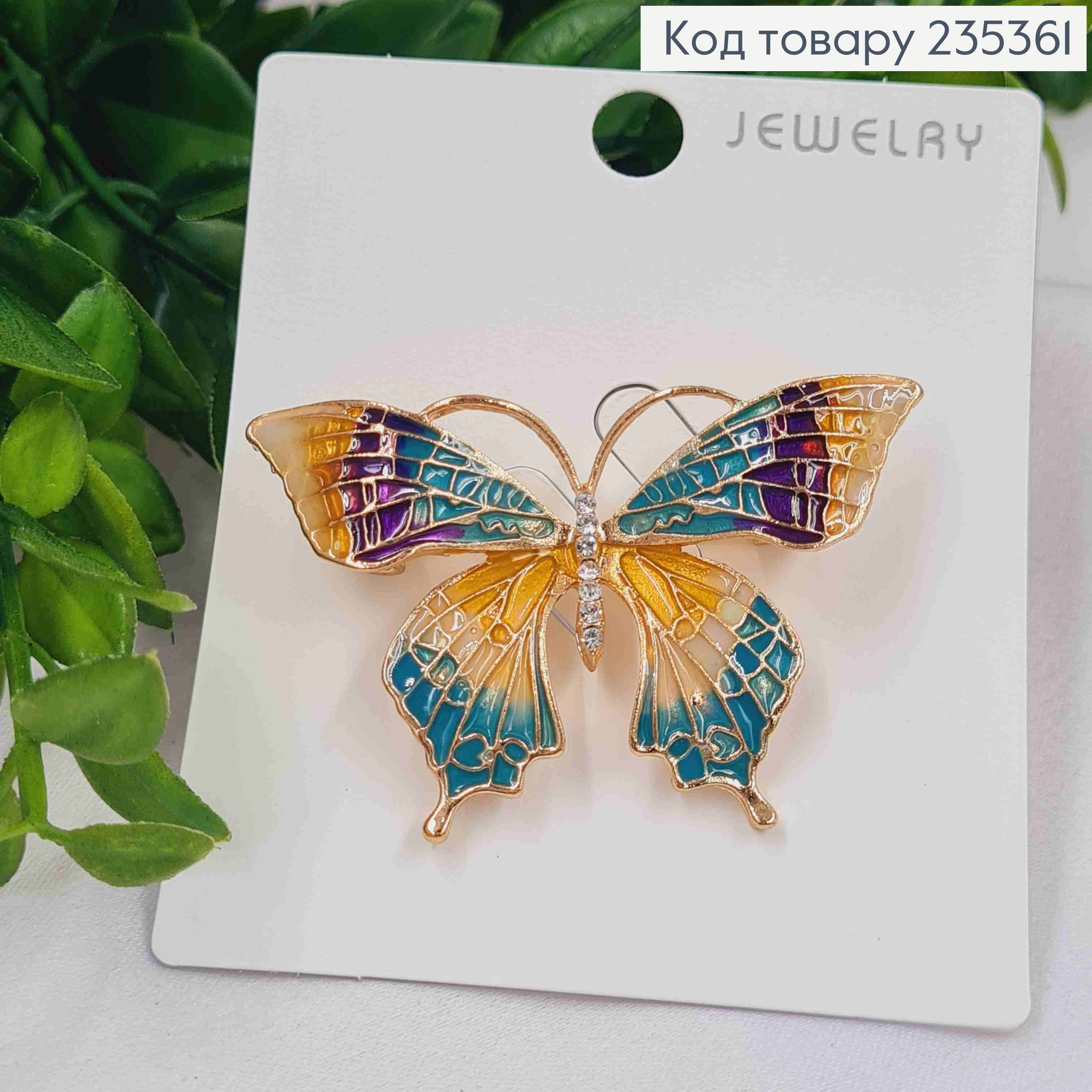 Брошь, "Бабочка" с камешками, Бирюзово-Желтых цветов, размер 5*3см, золотого цвета