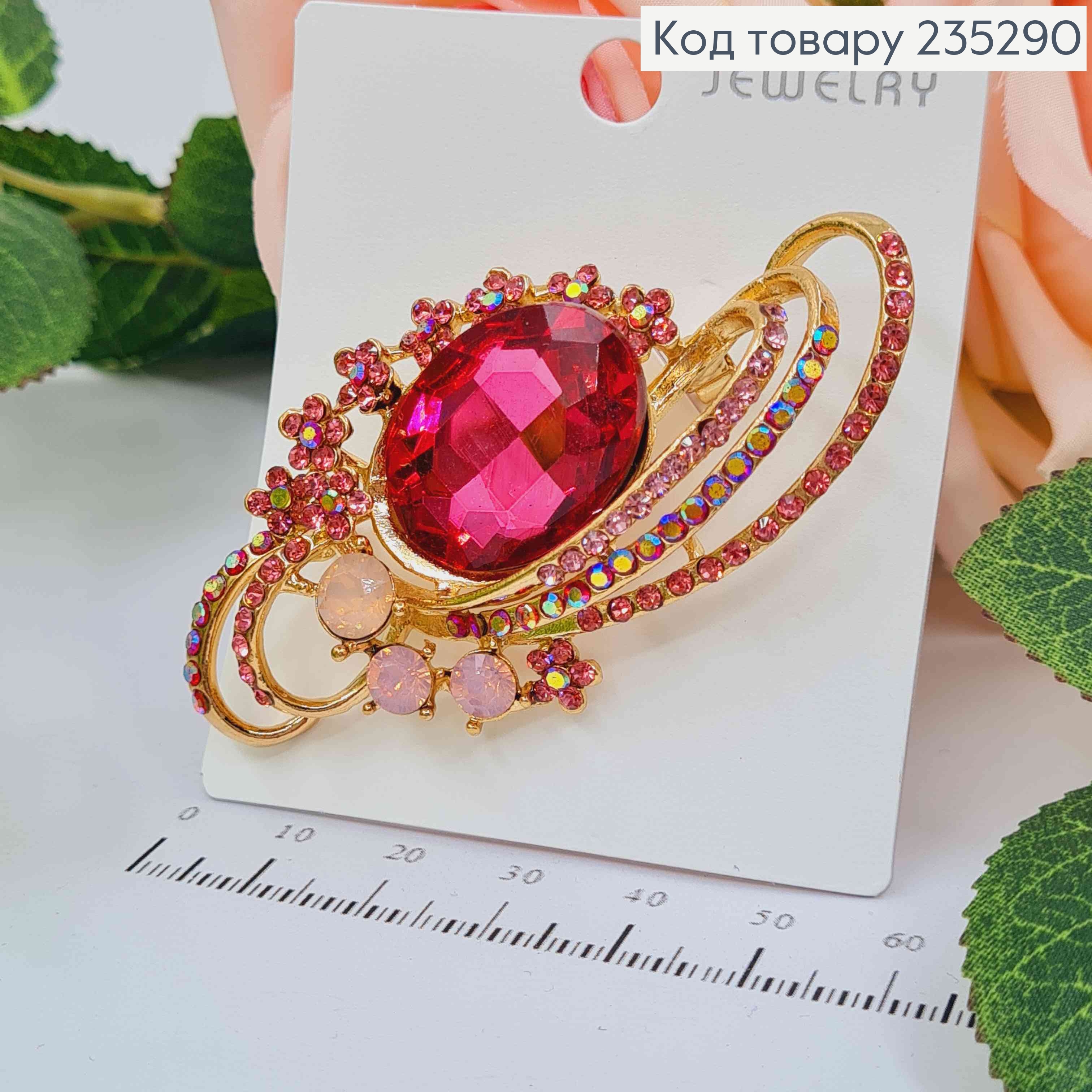 Брошь овальная Роскошная с большим камешком Розового цвета, 3*7см