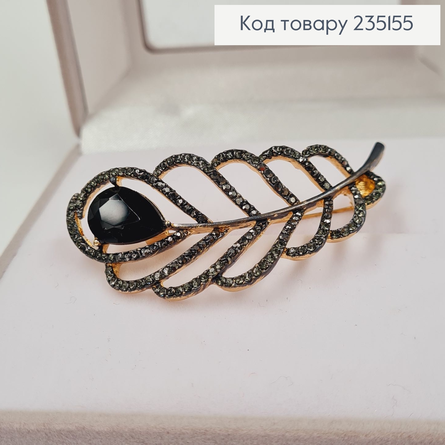 Брошка "Перо павлина" в чёрных камушках 6*3 см, золотой цвет.