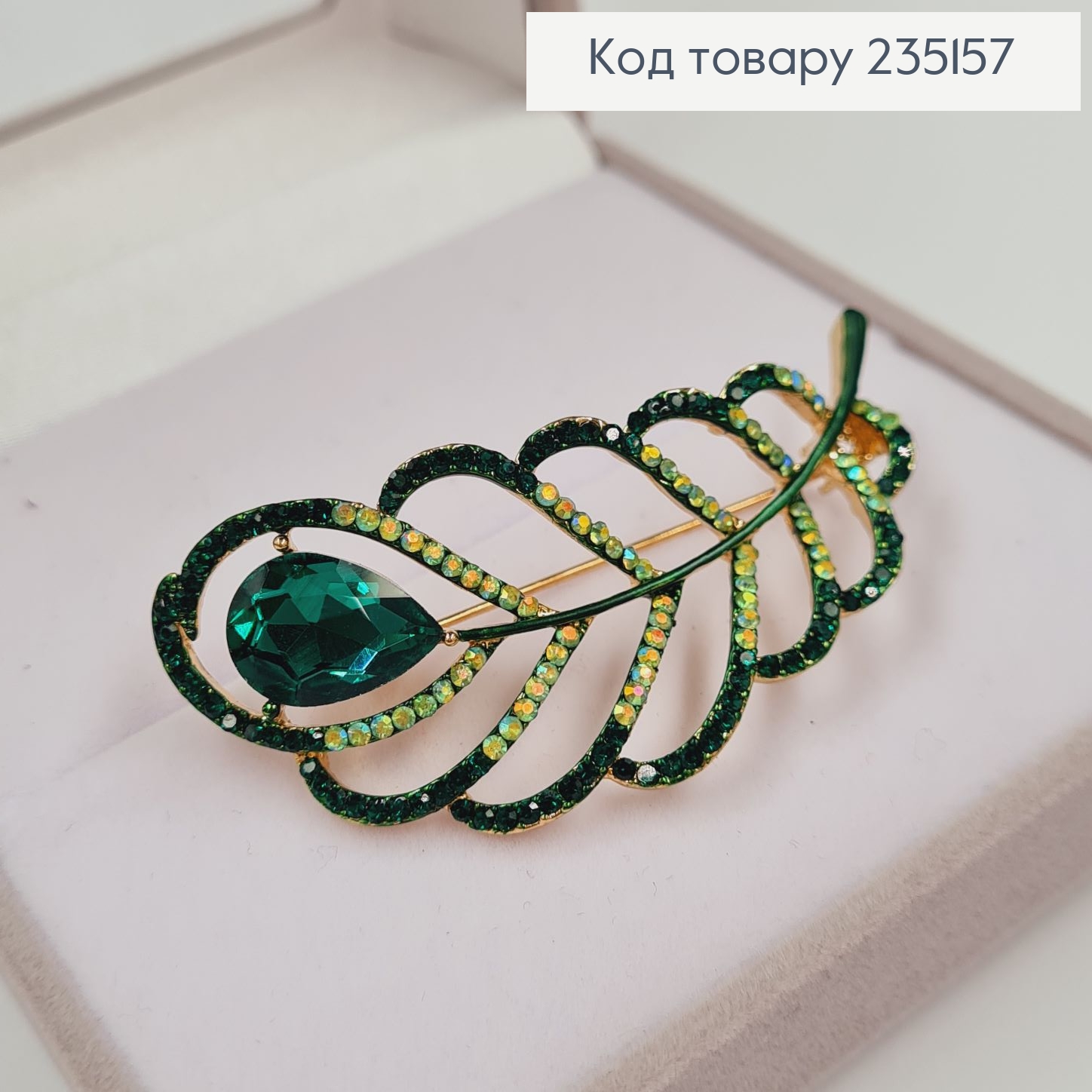 Брошка "Перо павлина" в зелёных камушках 6*3 см, золотой цвет.