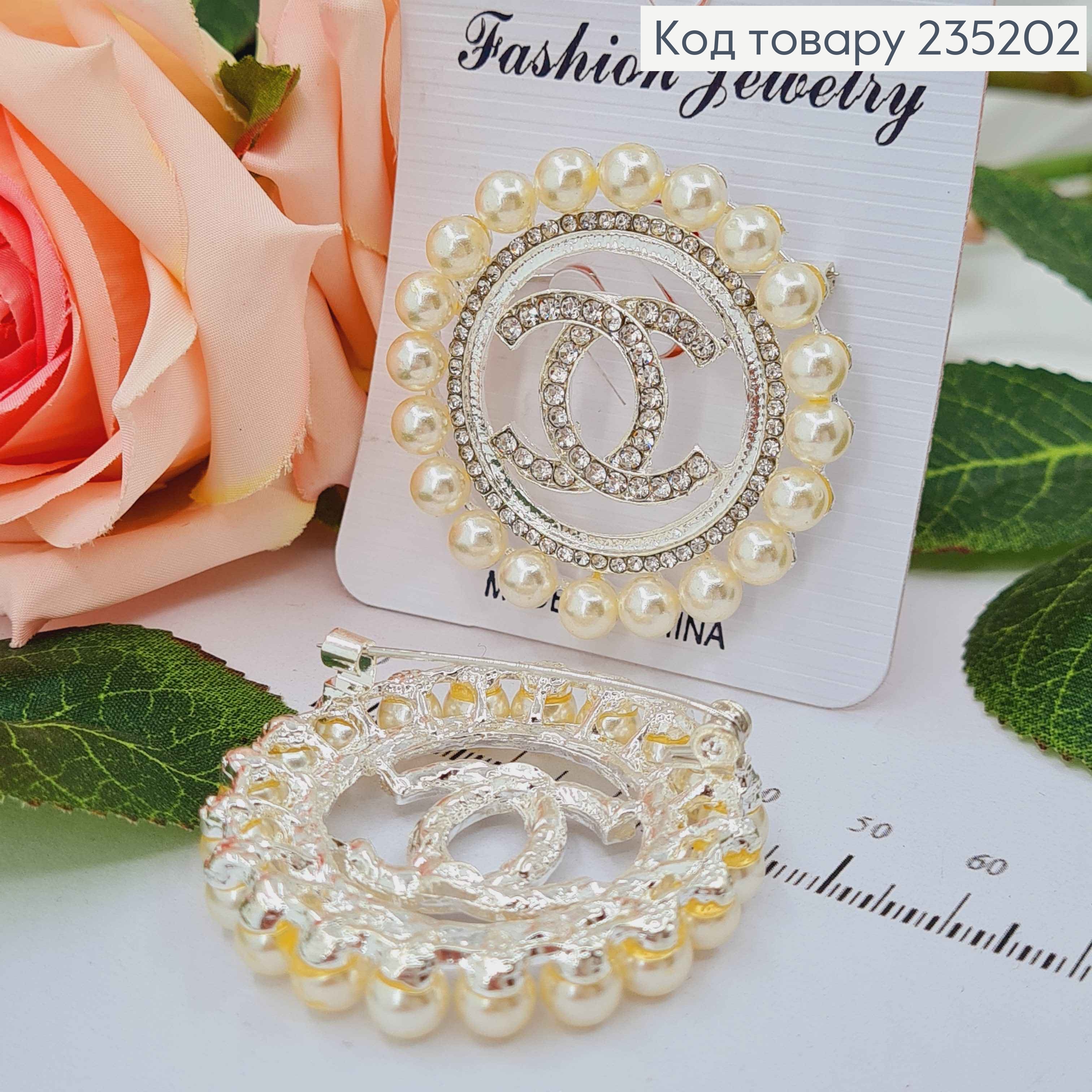 Брошь Шанель, серебряного цвета, в оправе с камешками и жемчужинами, 4,5см.