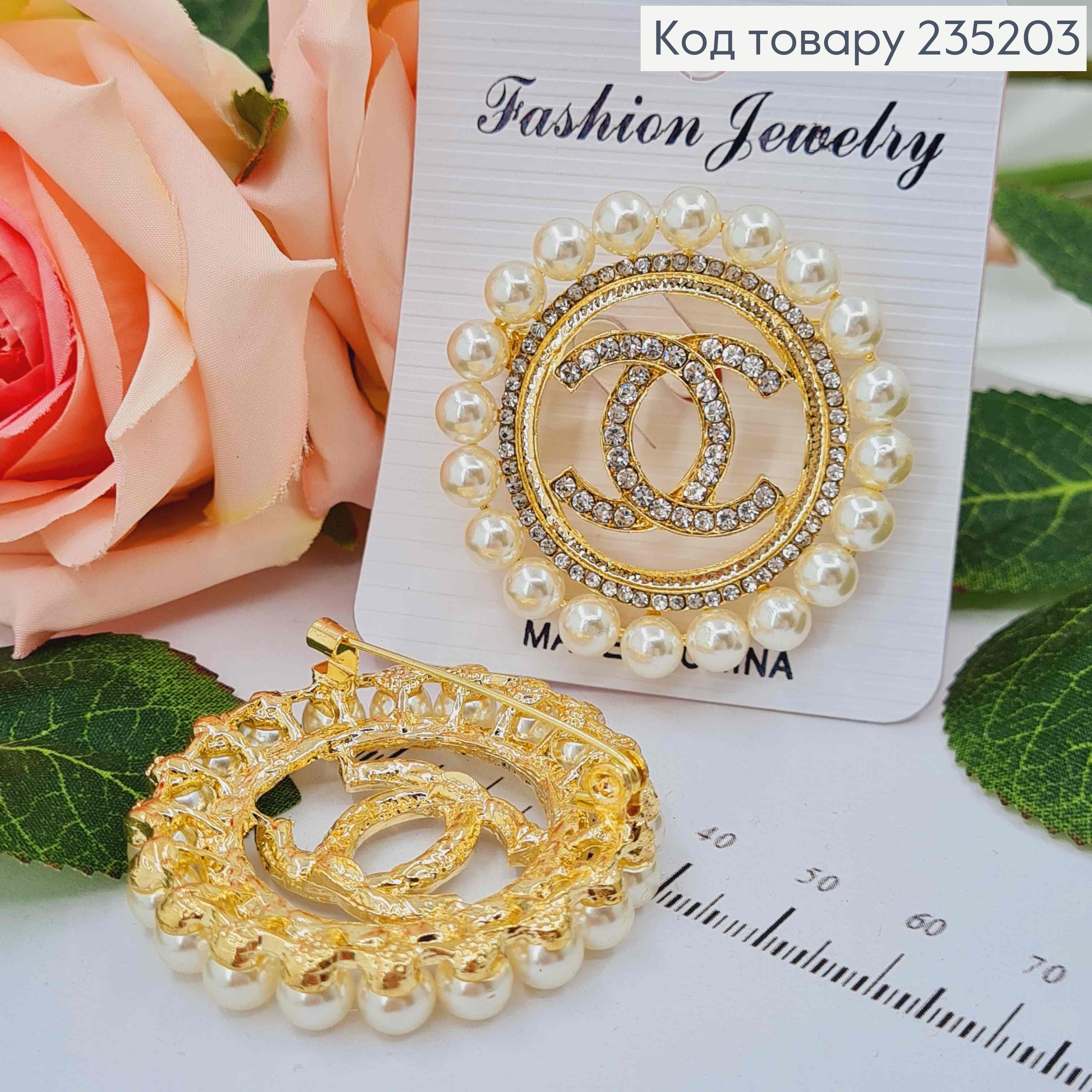 Брошь Шанель, золотого цвета, в оправе с камешками и жемчужинами, 4,5см.