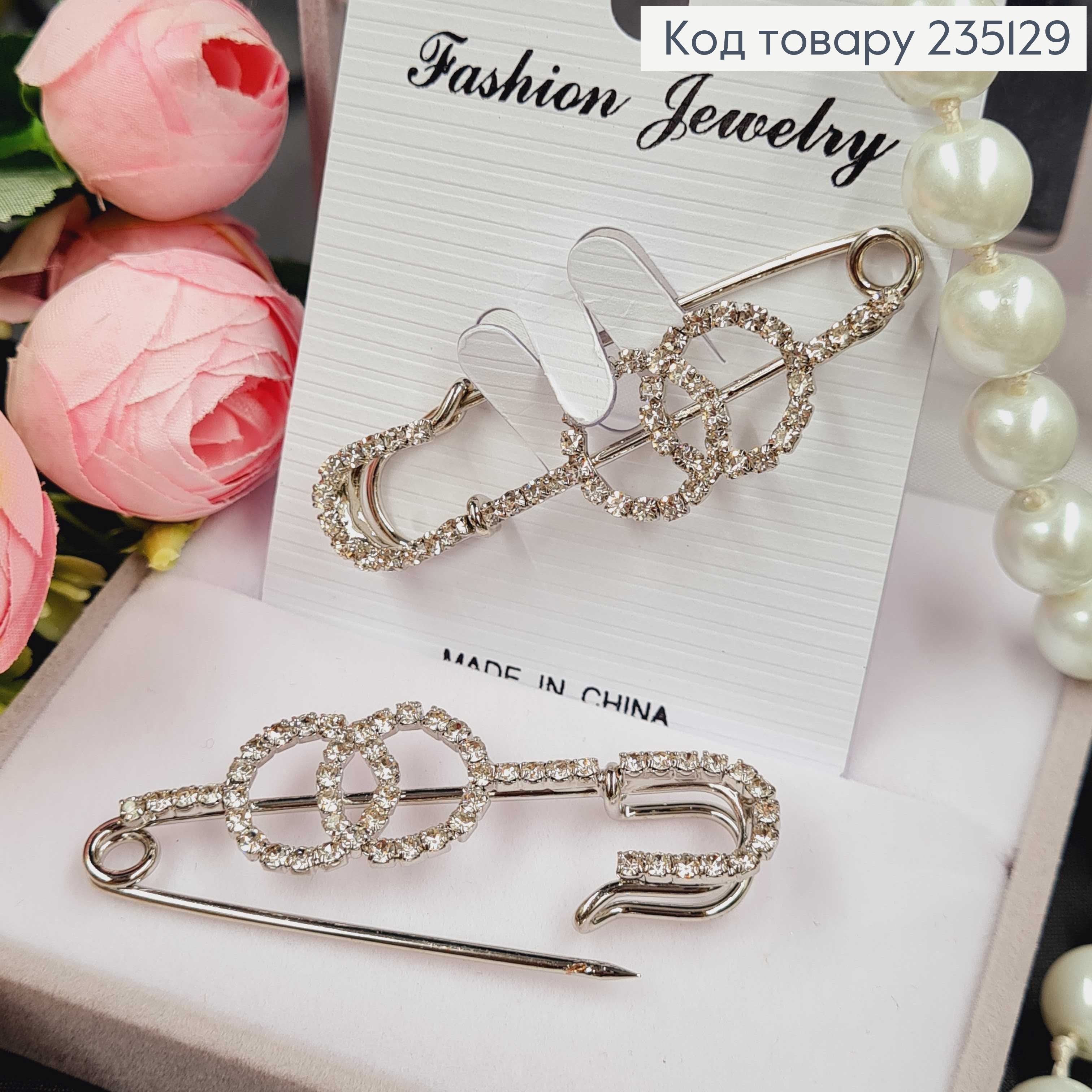 Брошка Шпилька "Два кольца" в камушках 5.5*2 см, серебряный цвет.