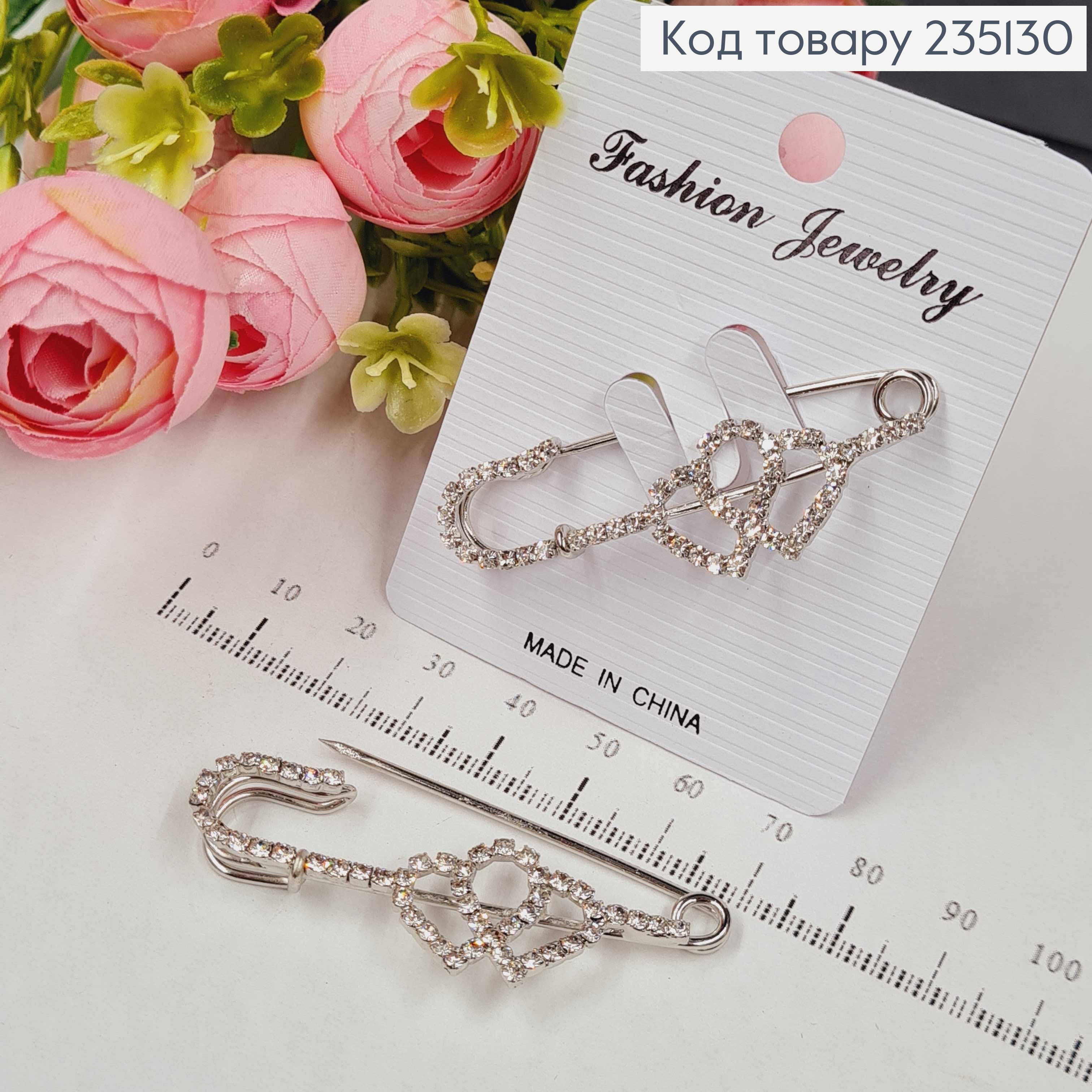 Брошка Шпилька "Два сердца" в камушках 5.5*2 см, серебряный цвет.
