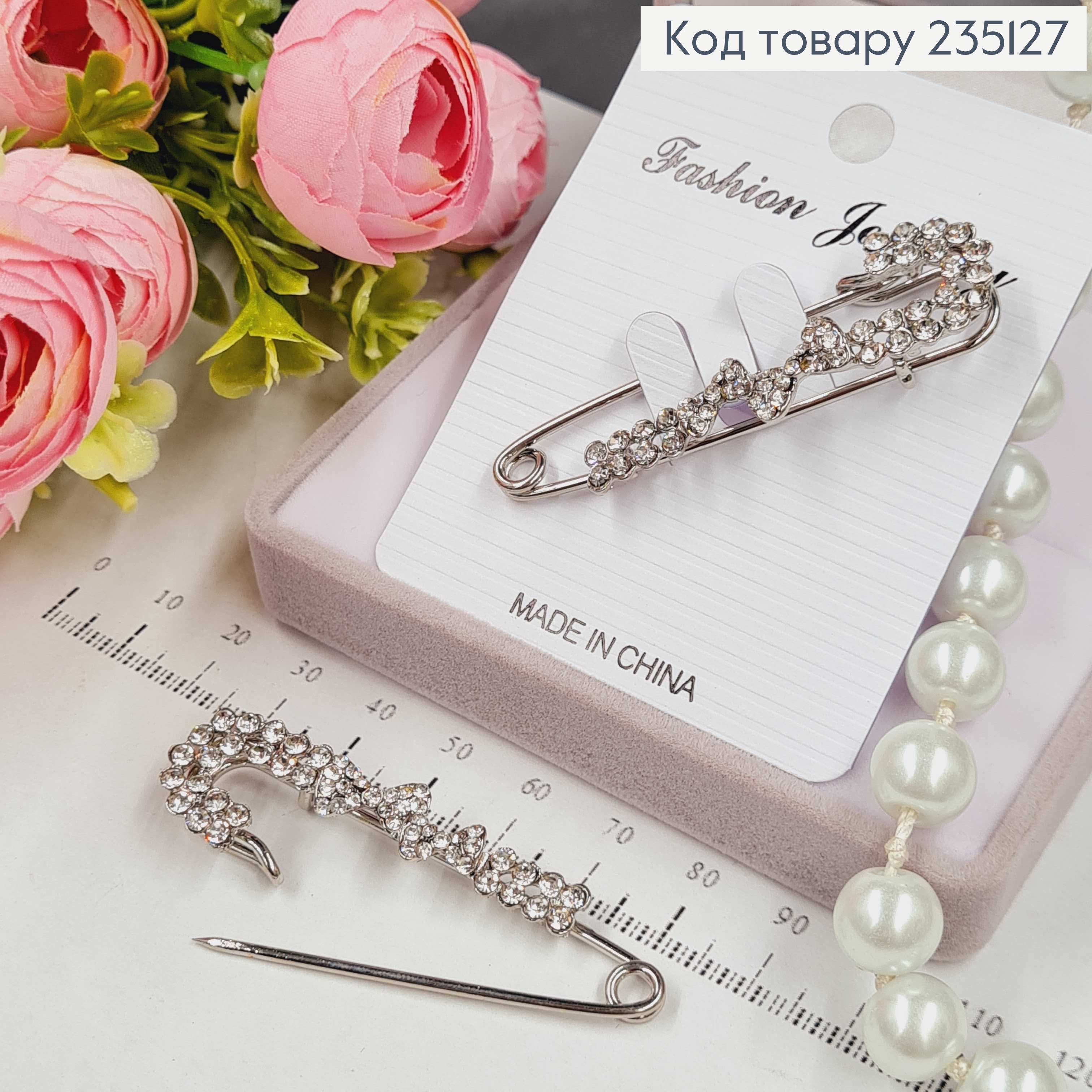 Брошка Шпилька "Два бантика" в камушках 5.5*1.5 см, серебряный цвет.