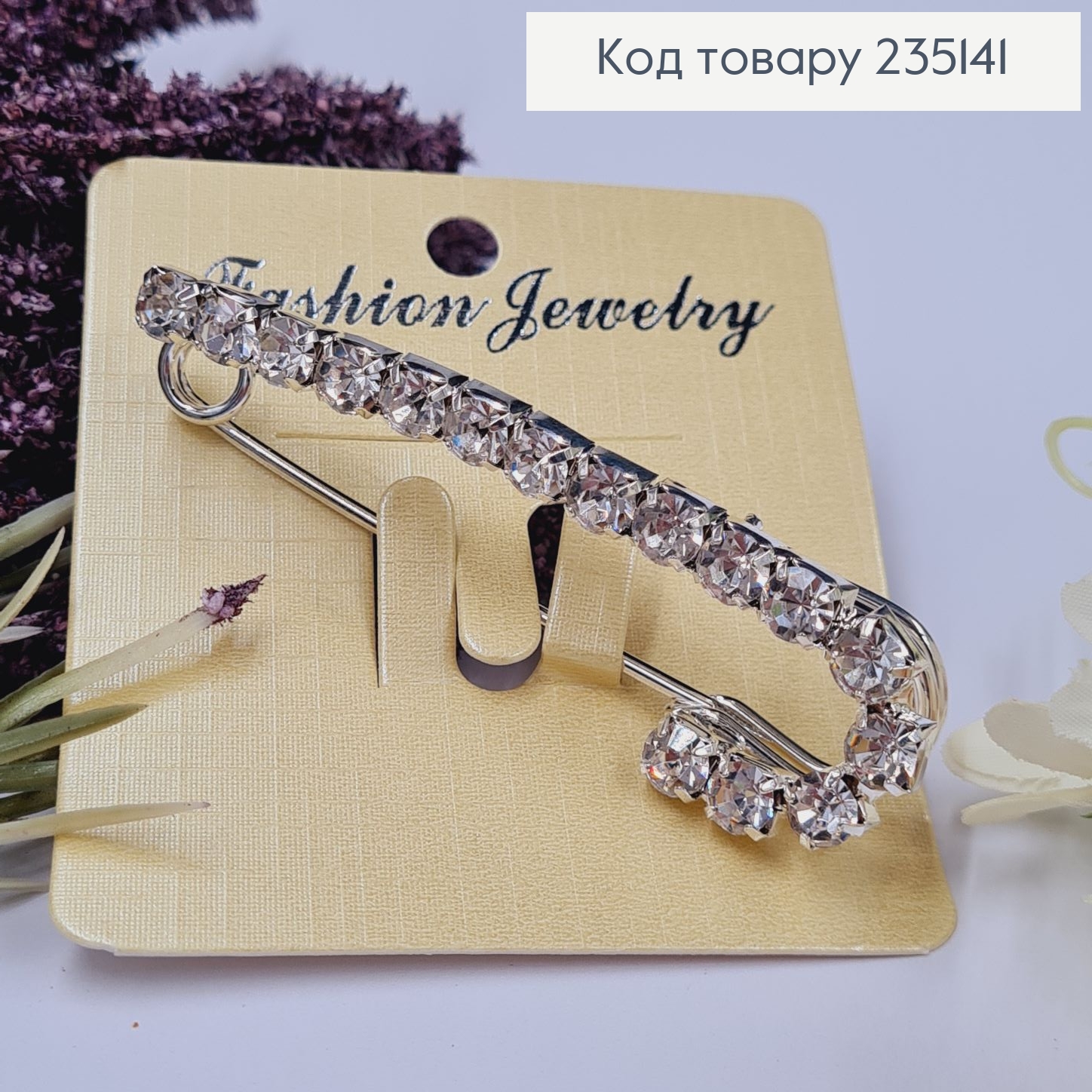 Брошка Шпилька с большими камнями "J" 6.5*2.5, серебряный цвет.