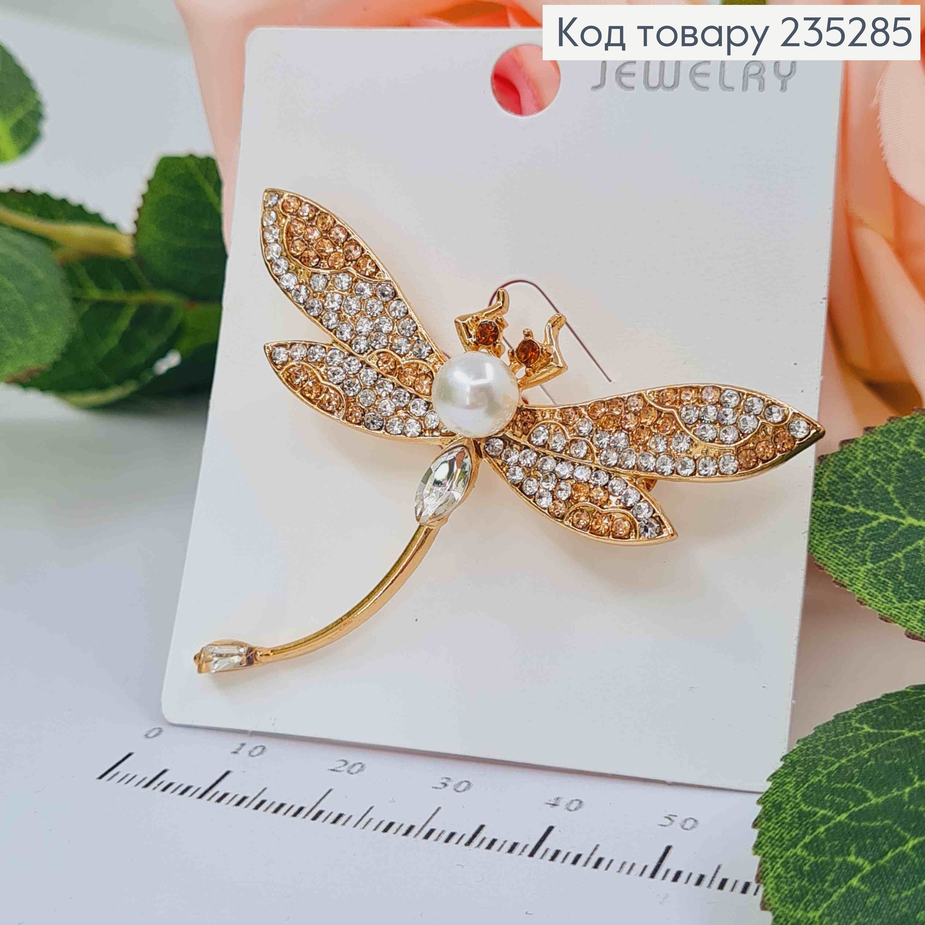 Брошь металл "СТРЕКОЗА" украшена Блестящими камешками и Перламутровой, 5,5*4см, Золотого цвета 235524 фото