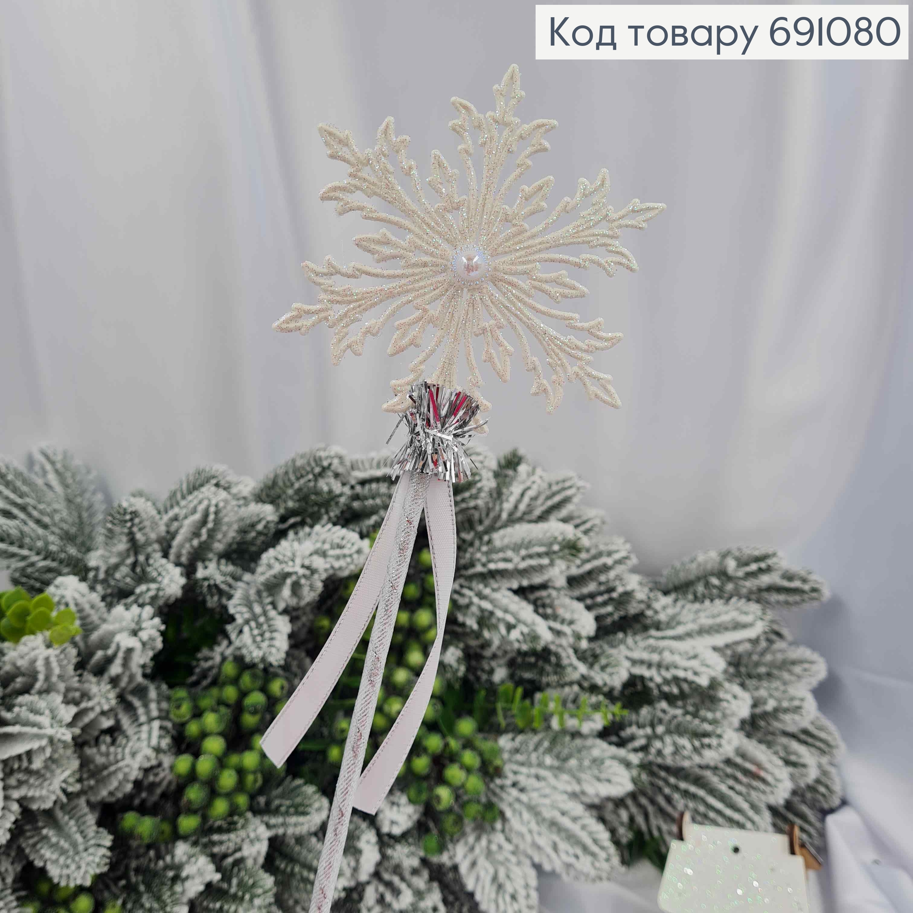 Волшебная палочка, блестящая Снежинка с бусинкой посередине, обтянутая Серебряной лентой, длина 44см
