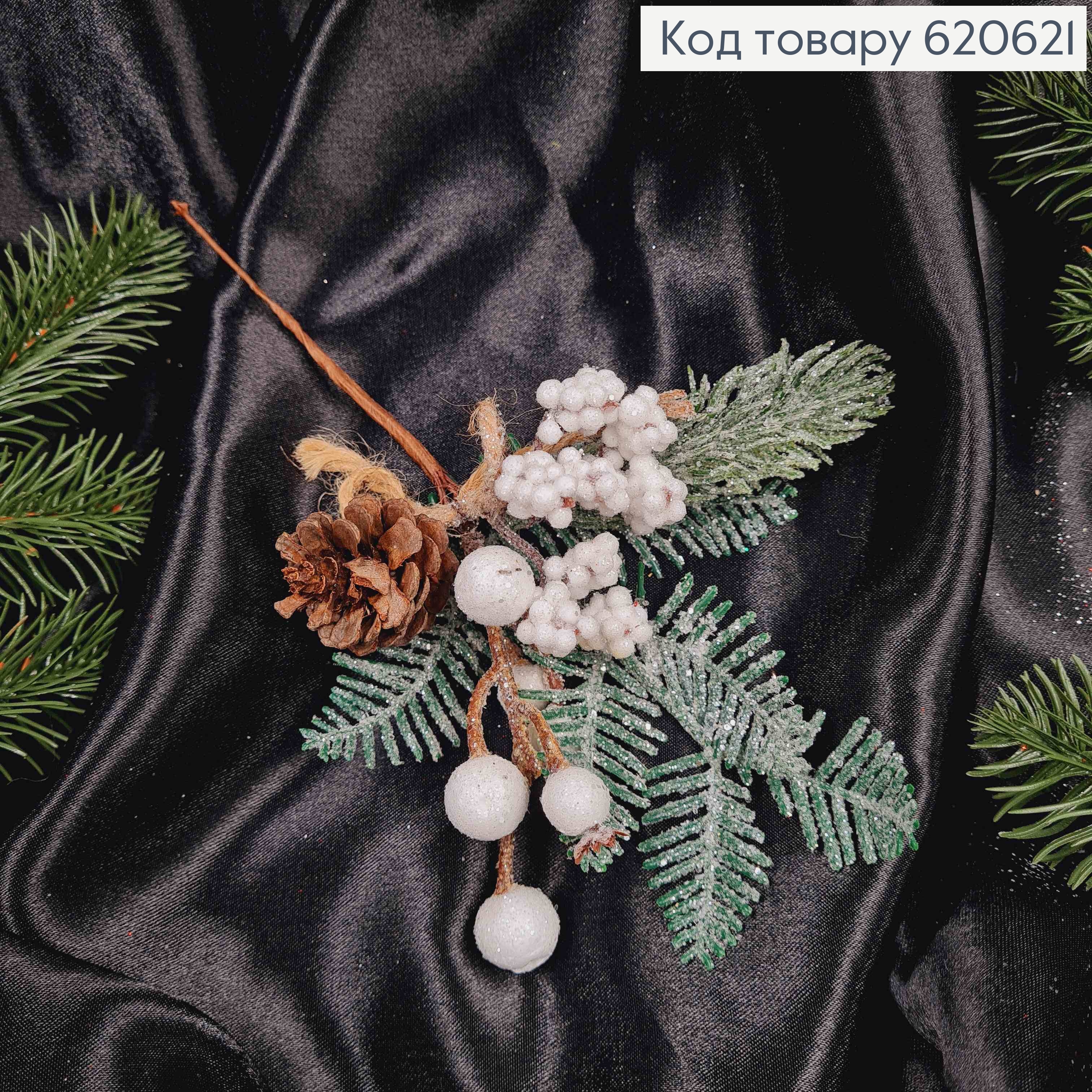 Декор "Хвойная веточка с белыми ягодками и шишками", на металлическом стержне, длина 24см