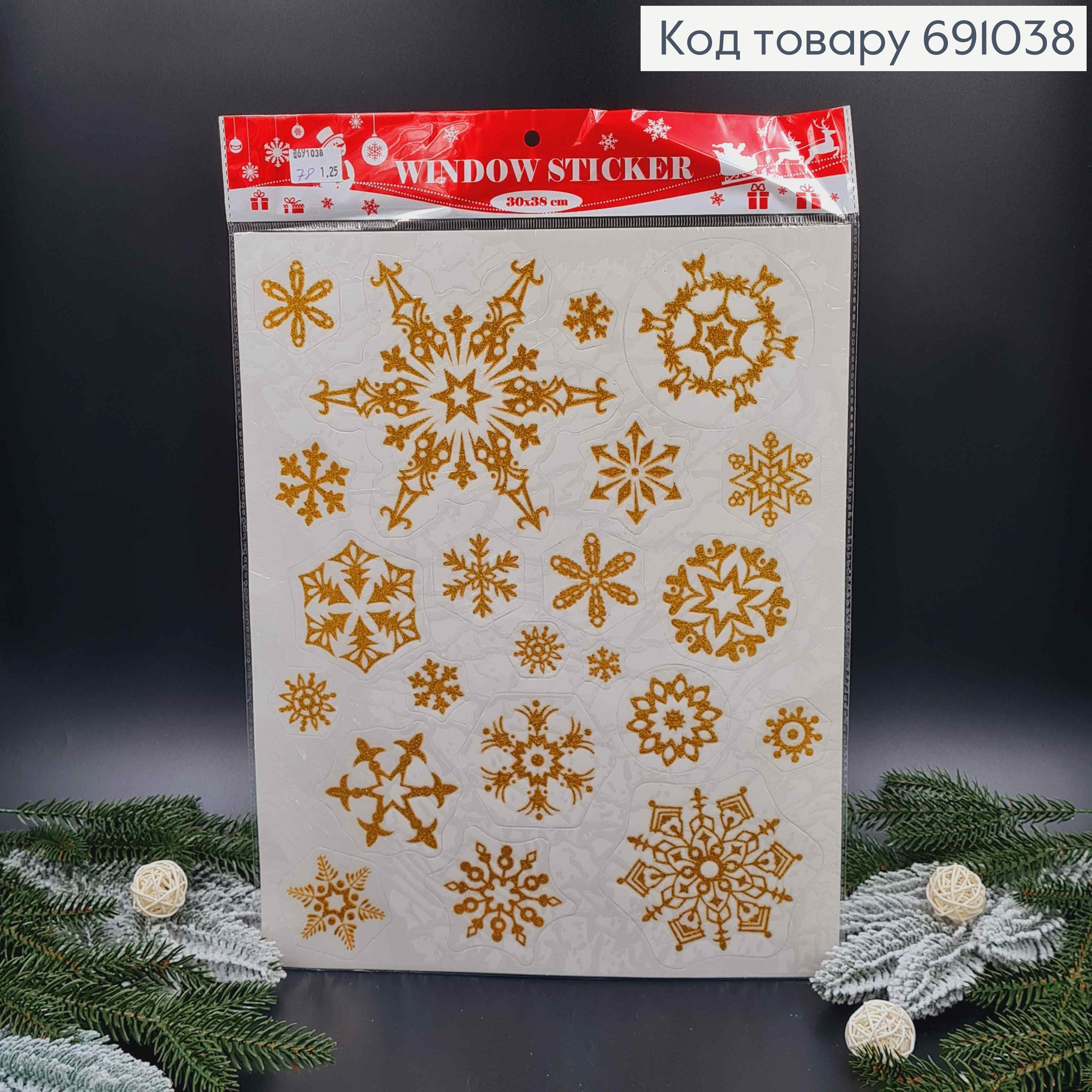 Декоративная Новогодняя наклейка на стекло, снежинки блеск, золотой цвет. 30*38см