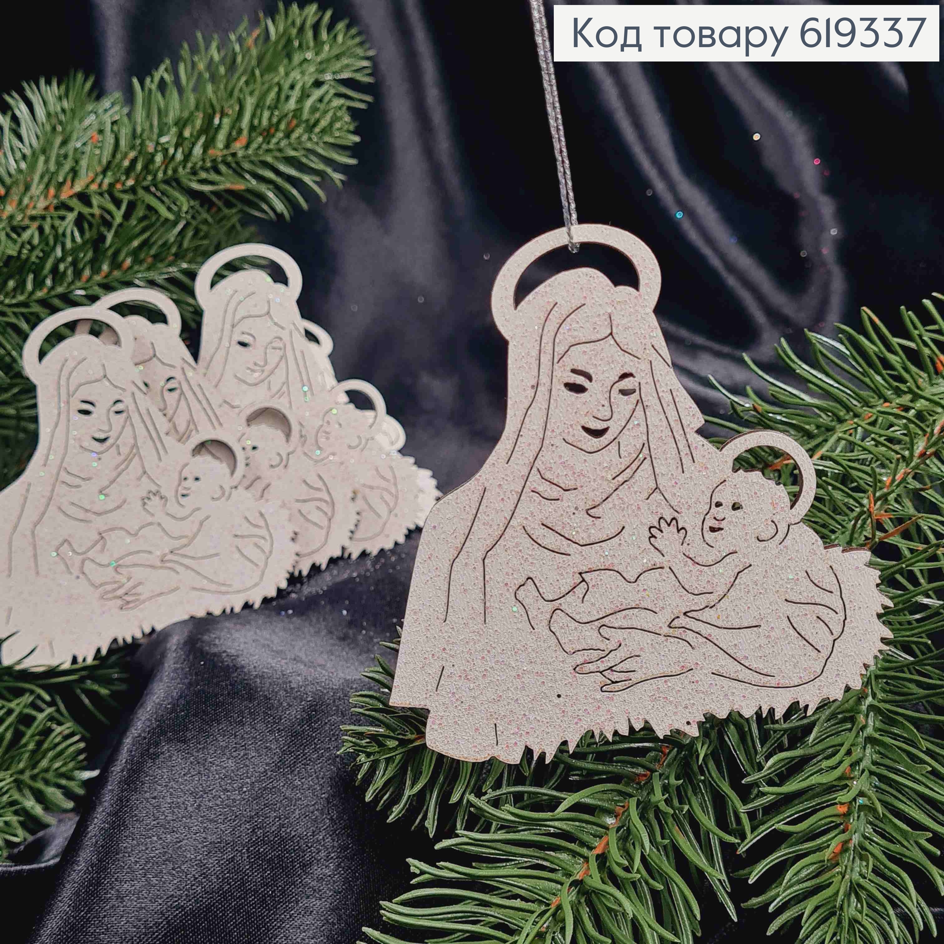 Деревянная игрушка композиция "Дева Мария с Иисусиком", белая с блеском, размер 8,5*8,5см.