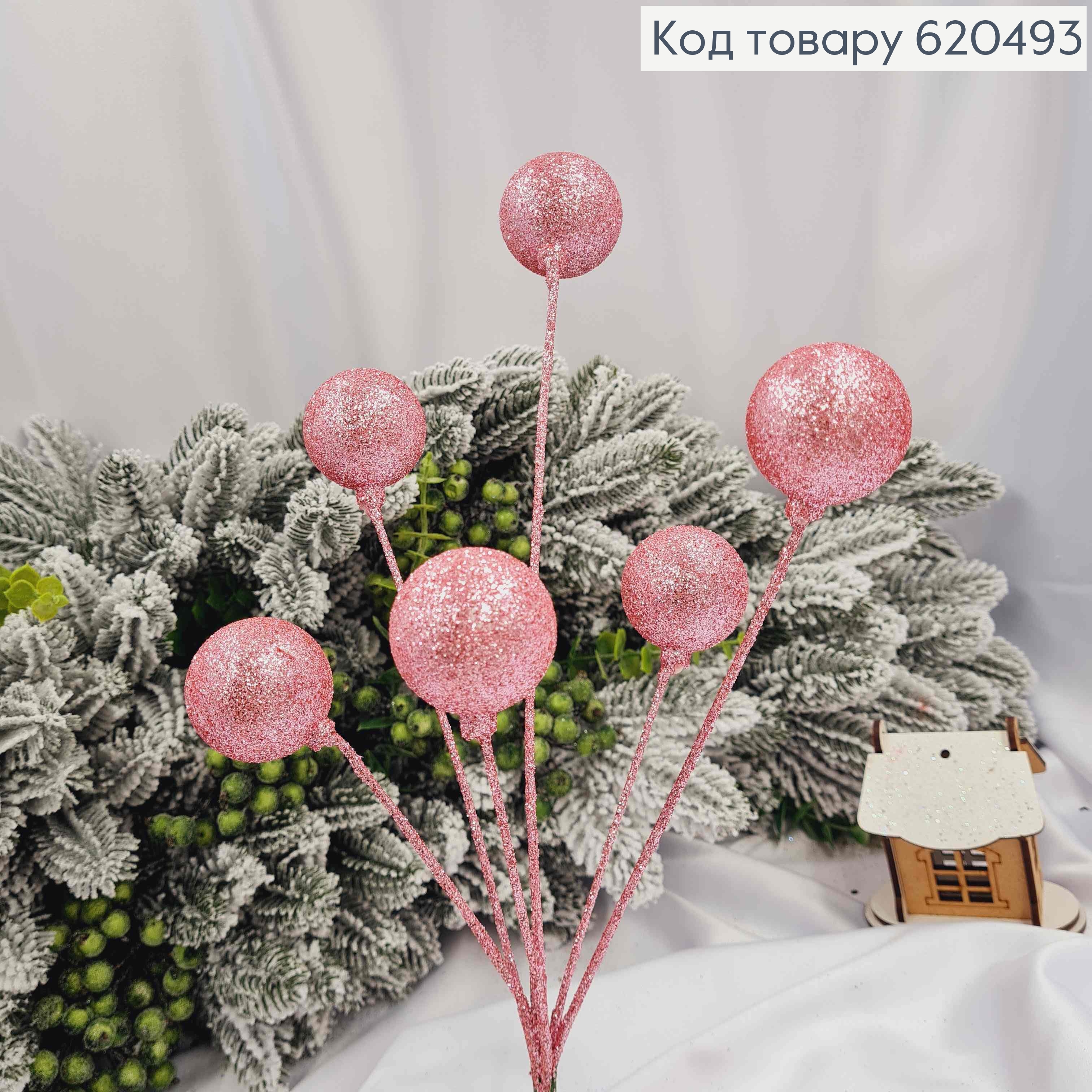 Веточка НОВОГОДНЯЯ, блеск РОЗОВЫЕ Шарики, 6шт, 38см
