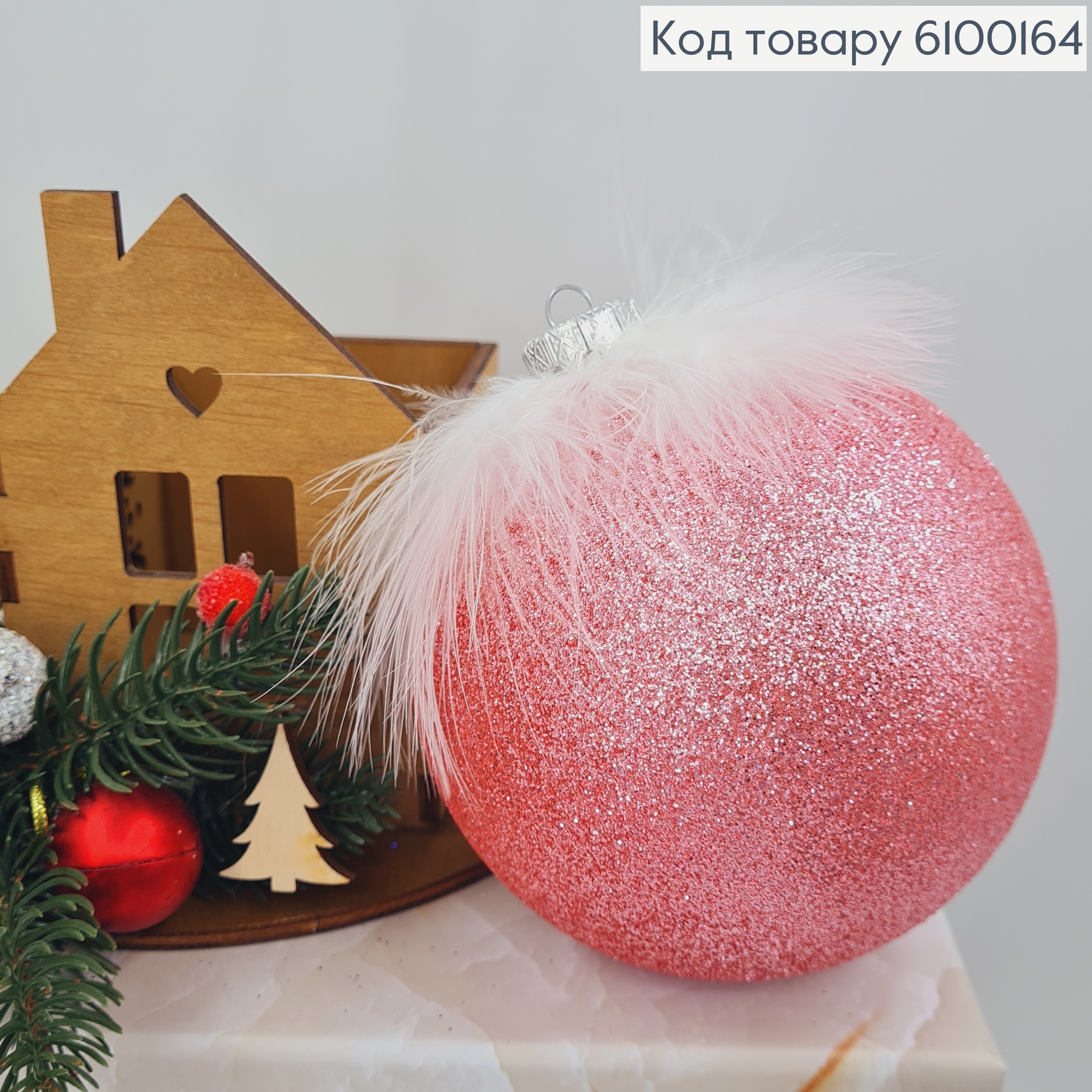 Игрушка шар 100 мм с перышком розовоя