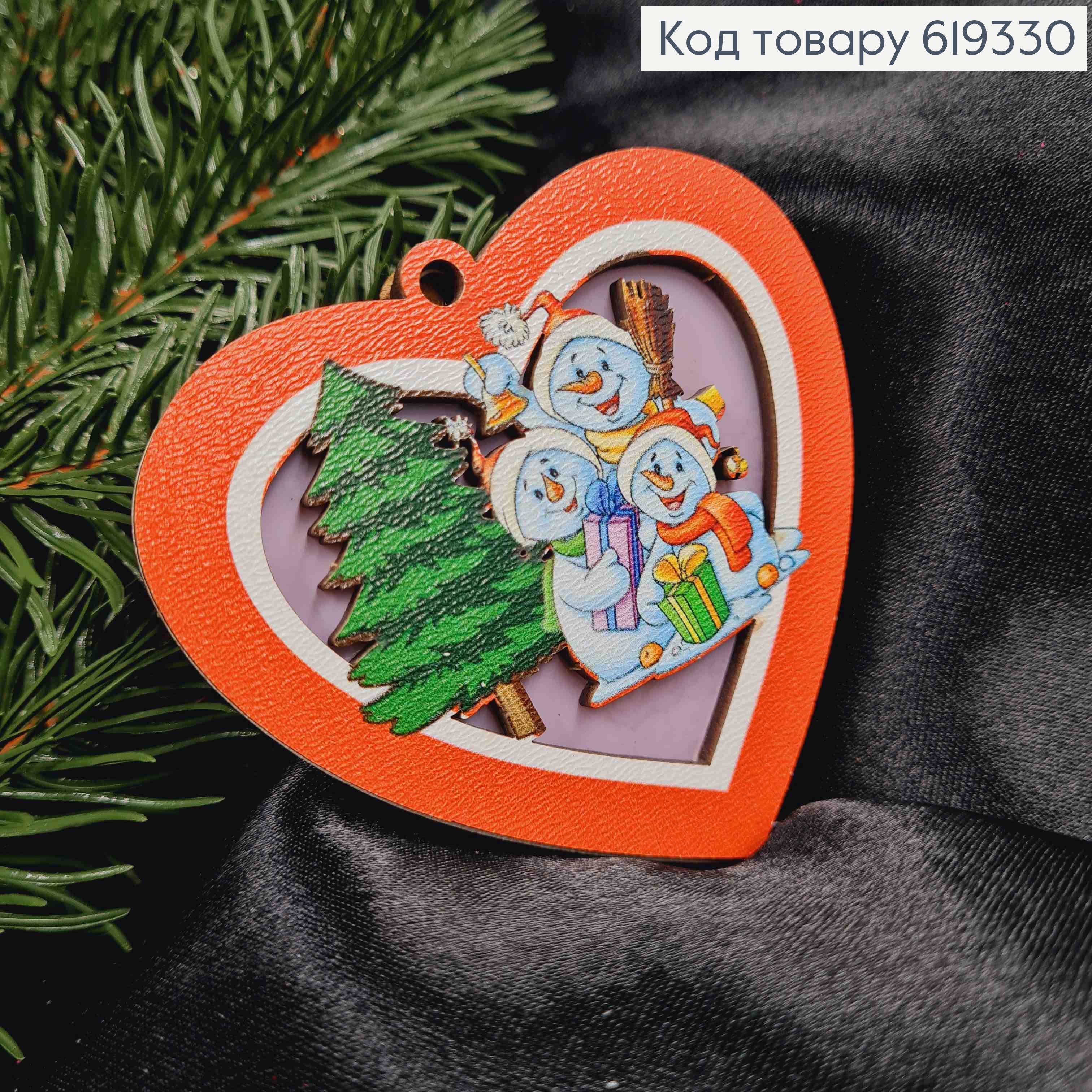 Игрушка на елку деревянная, СЕРДЦЕ со Снеговиками внутри (светится), 7,5*7*1см, Украина