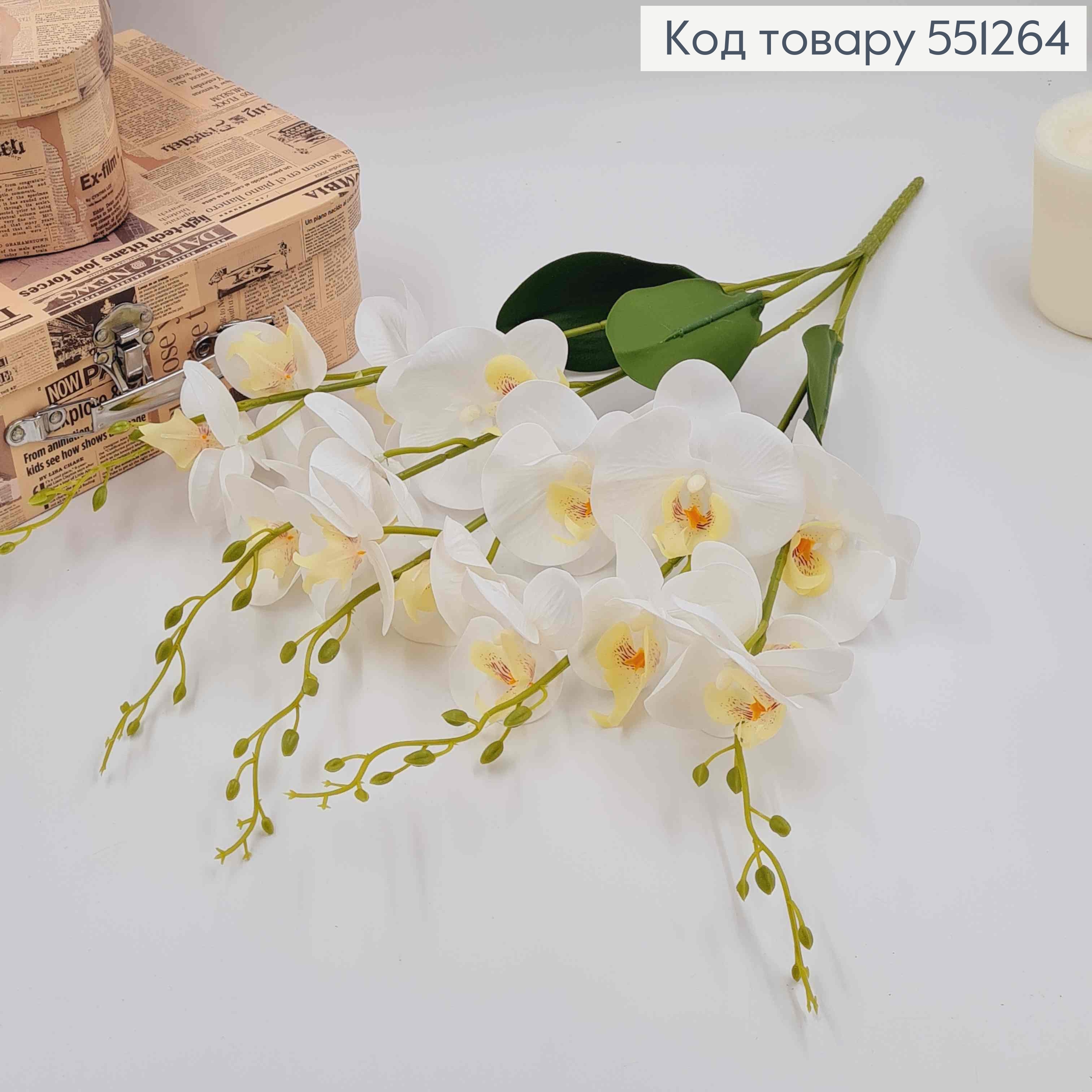 Композиция "5 веточек БЕЛОЙ латексной орхидеи с листочками", высотой 55см, цветочки 7*8см (15шт)